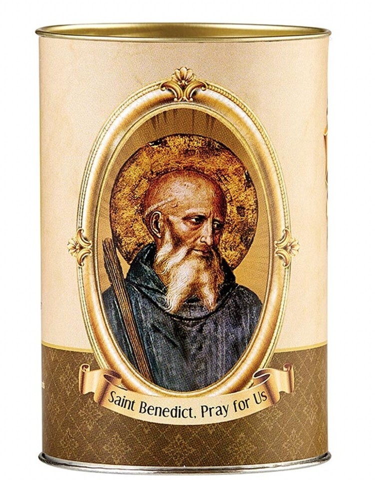 You are purchasing a paper tin 3.50" small candle with an image Prayer of Saint Benedict.