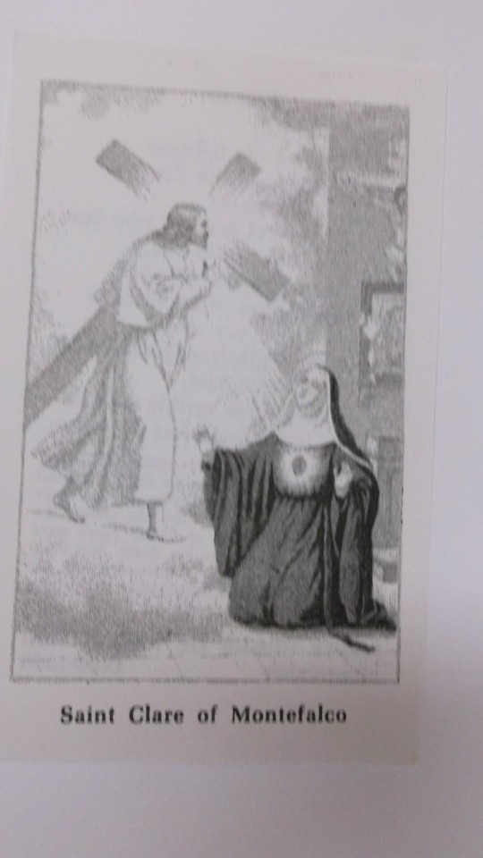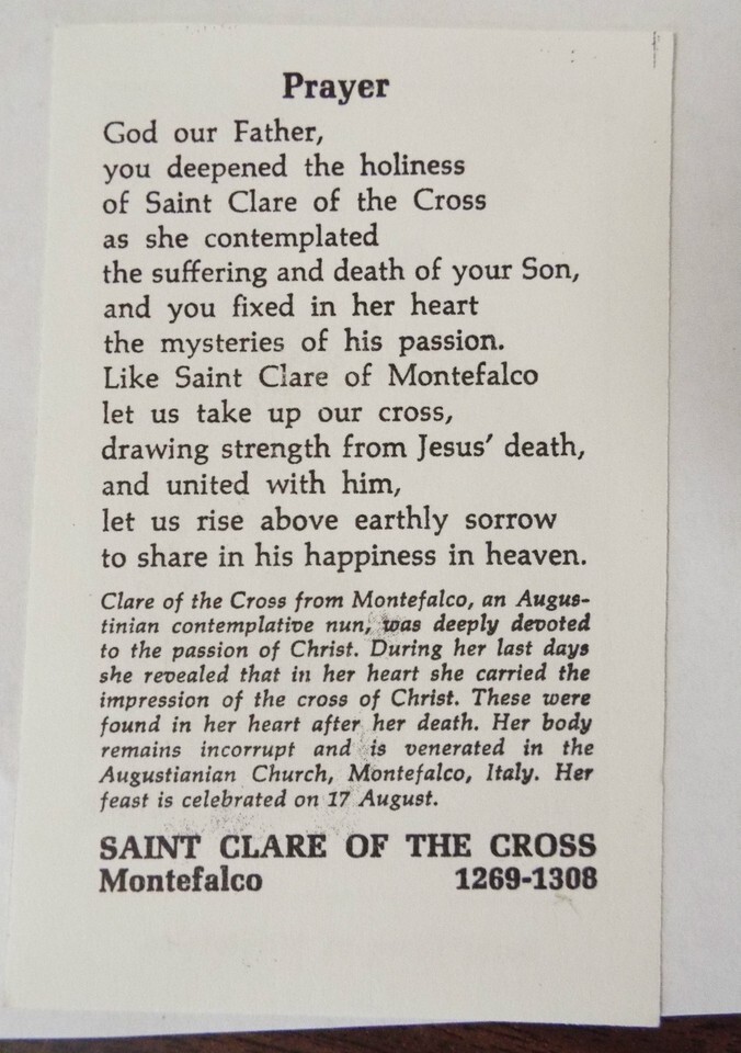 You are purchasing a paper stock black white prayer card of Saint Clare of Montefalco. She is also known as the saint that bore the Cross of Christ and the Crown of Thorns. Were brought from her shrine in Italy. Approximate measurements: 4 3/4" X 2 7/8".