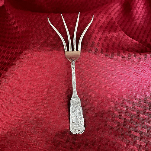 Sterling Silver ROAST CARVING FORK 11" in the pattern SAINT CLOUD BY GORHAM. It is monogrammed (MONOS VARY) and is in excellent condition.