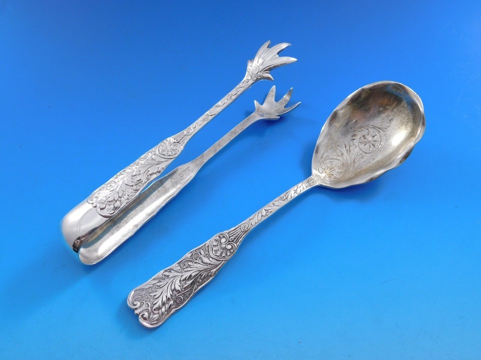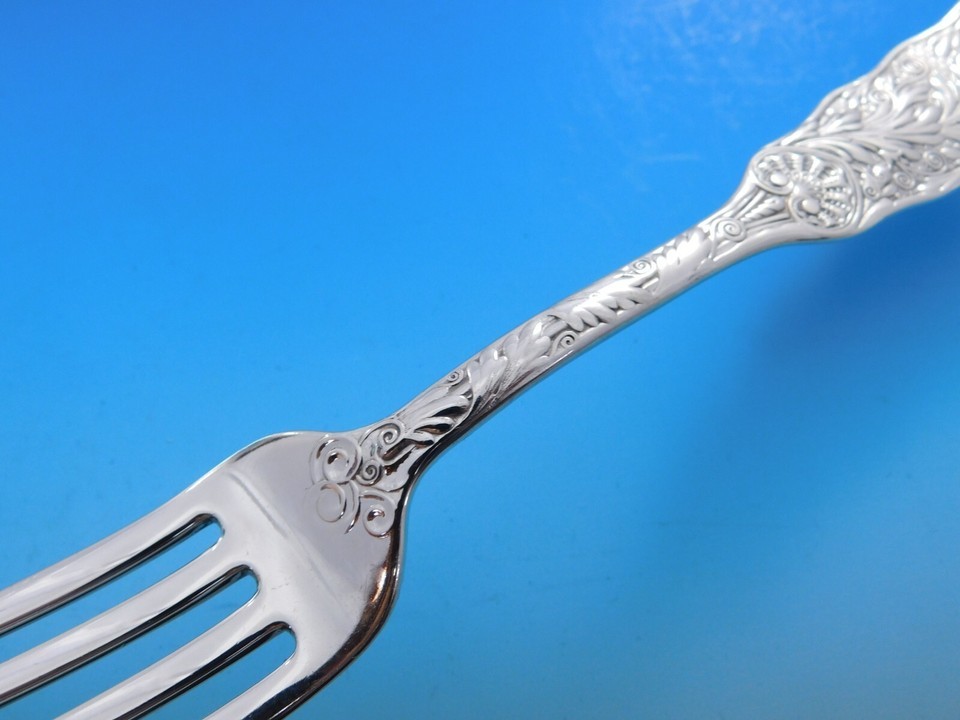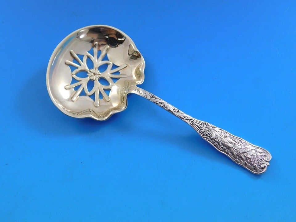 Evidence and the intricacy of this pattern suggests that famous Antoine Heller designed St. Cloud (some say it was designed by Walter Wilkinson, but we believe Heller designed this extraordinary pattern). Heller worked as a die chaser - he hand finished the molds used in die stamping silver. Due to the technical difficulty and great detail of the work - and the great expense of making dies for stamping - this was traditionally the highest paying craft position in a silver (or metal) shop. Heller went on to design silver at Gorham and left to work for Tiffany, creating the Olympian pattern. After that he studied at L'Ecole des Beaux Arts in Paris, where Gorham lured him back to work in Providence, where he created some of the most exquisitely die stamped patterns ever made including: Old Masters, Versailles, Cluny, St. Cloud and Mythologique. (See Gorham Silver by Charles Carpenter and the Gorham Flatware 1888 Catalog Reprint.)