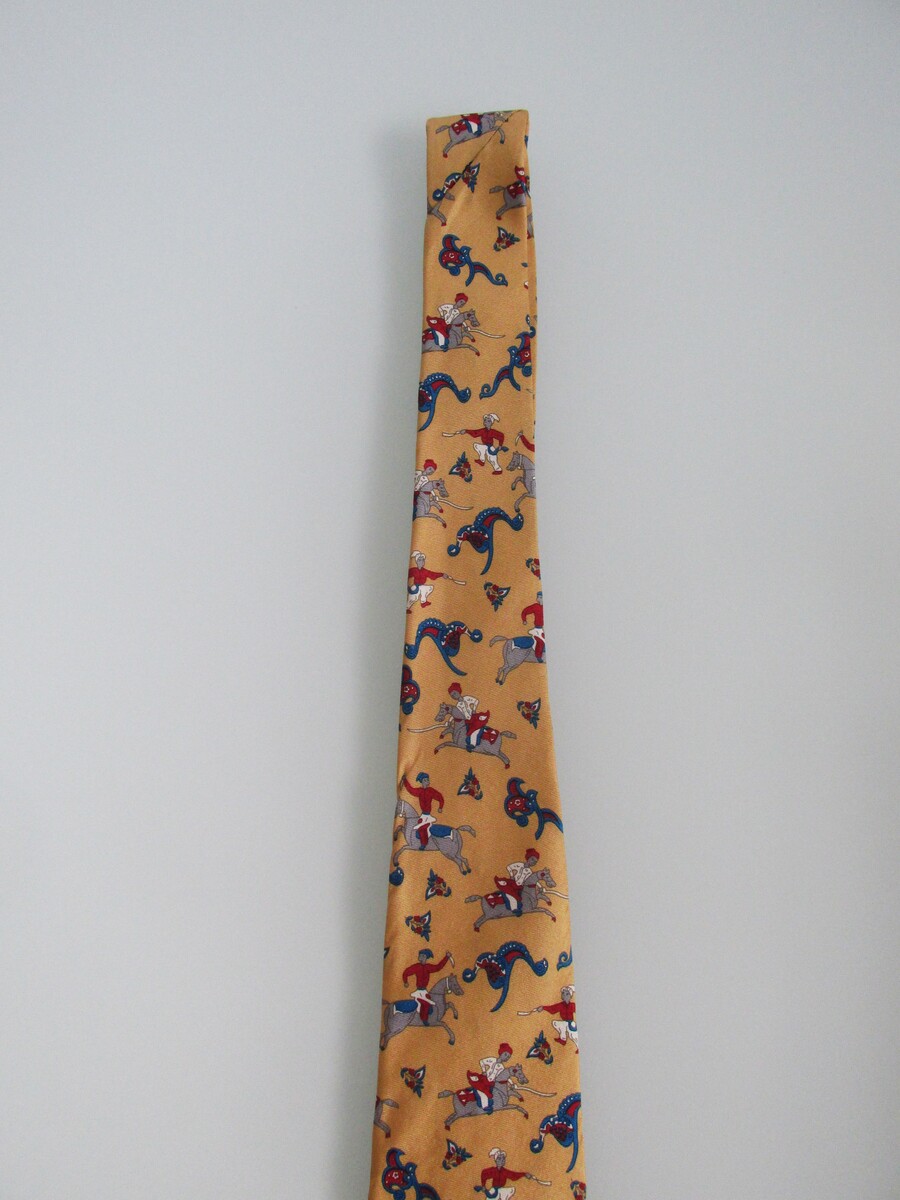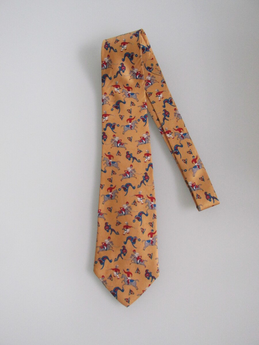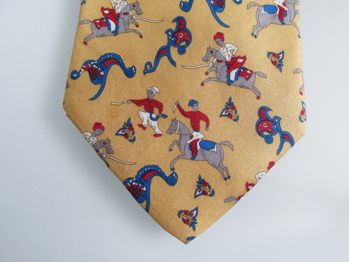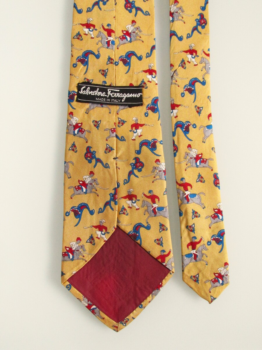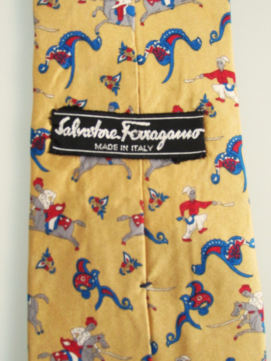 Description: Up for sale is a Salvatore Ferragamo men's designer silk tie. It is handmade in Italy from 100% silk. The dimensions are approximately 56" long x 3.75" wide. The tie has a multicolored Arabian Nights motif in gray, blue, red white on a light gold colored background. This tie is in excellent condition but does have a very faint spot on the tie. Please see pictures #2 6.