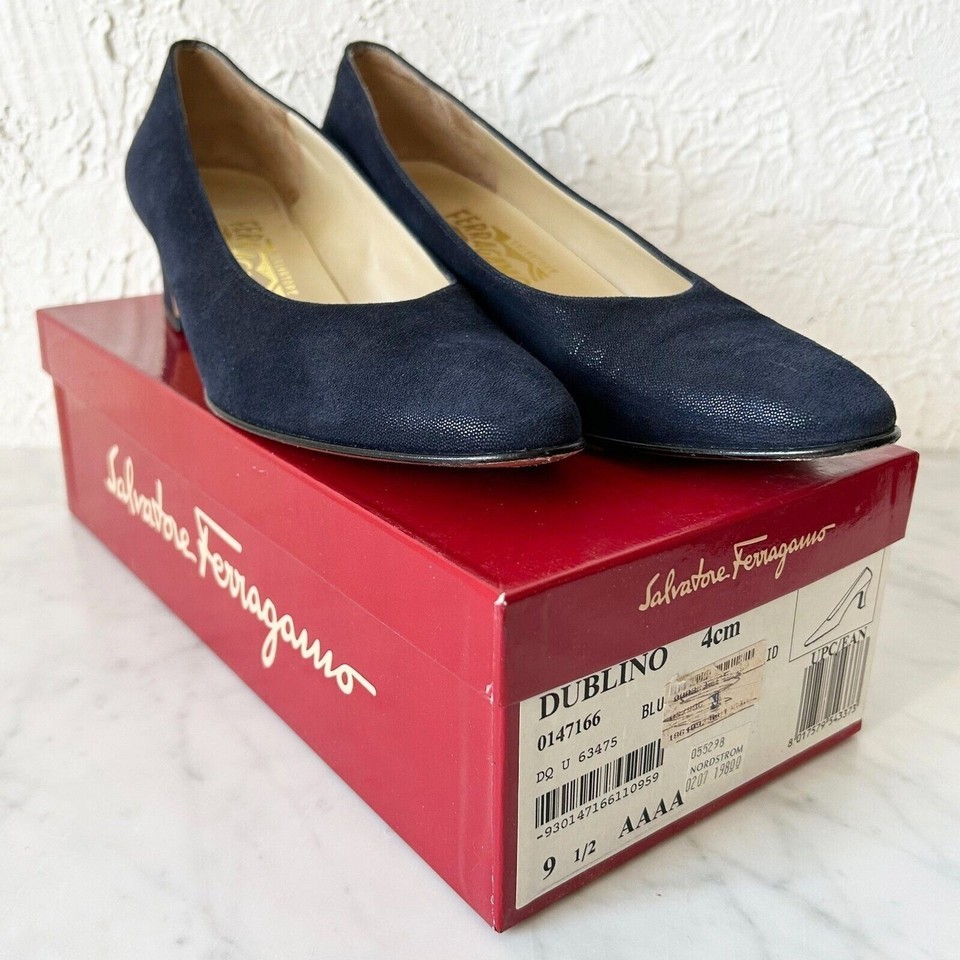 Salvatore Ferragamo Dublino pumps, Women's size 9-1/2 AAAA. Deep blue pebbled suede leather upper. Clean, padded leather insole, leather outsole. 2" flared heels. Shoes are in original box.