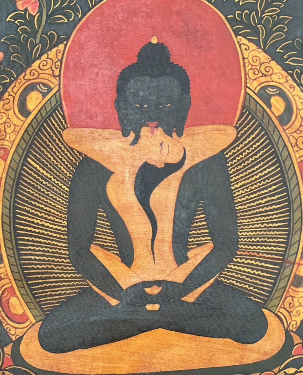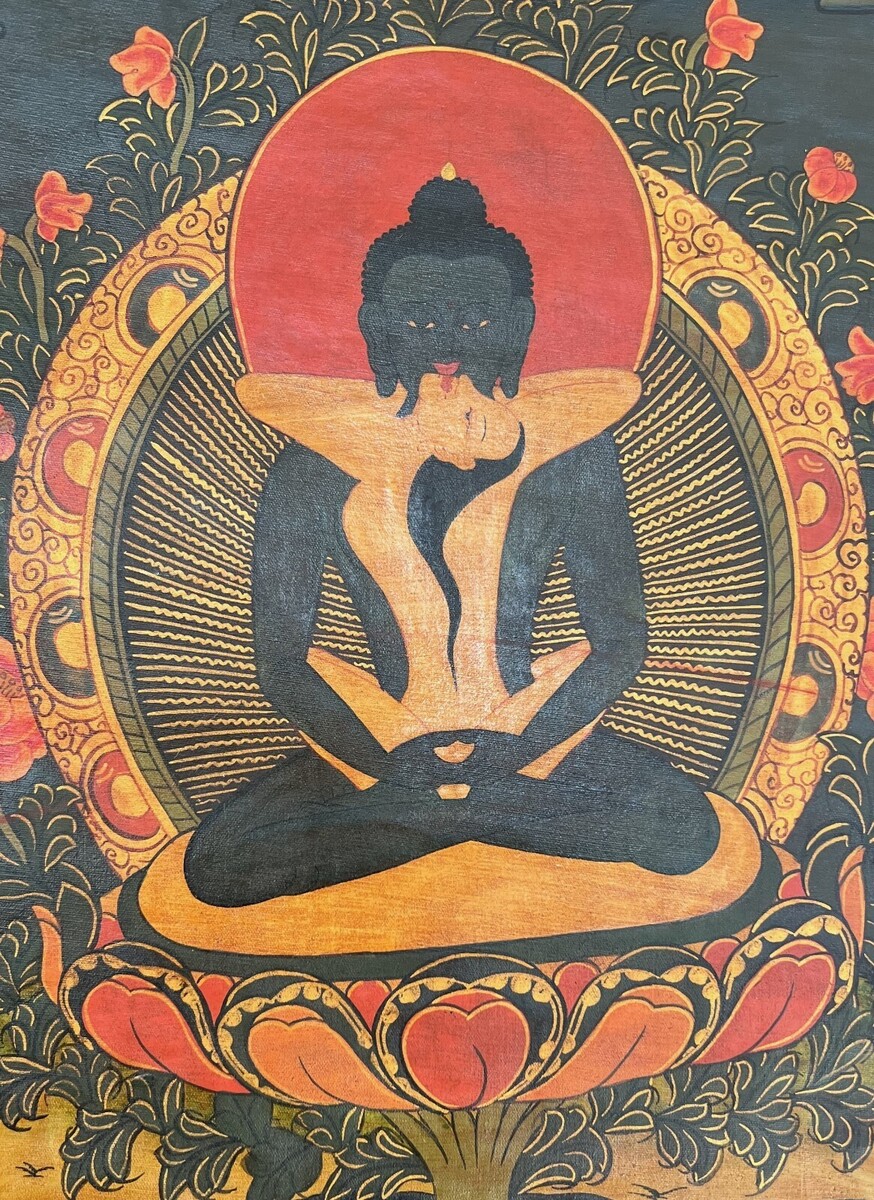 In this thangka, the divine union unfolds as Buddha Shakti embraces his consort Samantabhadri in the sacred Yab-Yum posture. Adorned with a rich blue hue, Buddha Shakti sits in a 'vajra' posture, his naked form symbolizing the original nature of the mind. With hands gracefully placed on his lap in a meditative gesture, Buddha Shakti becomes a powerful representation of the unity between awareness and compassion.