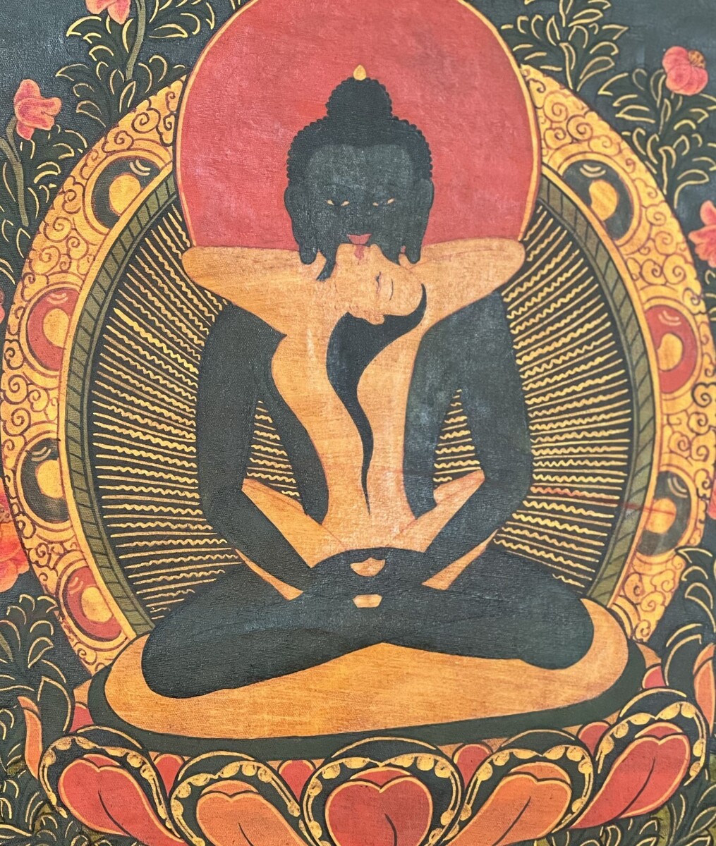 - SAMANTABHADRA OLD OIL- VARNISHED TIBETAN THANGKA PAINTING WITH SILK BROCADE