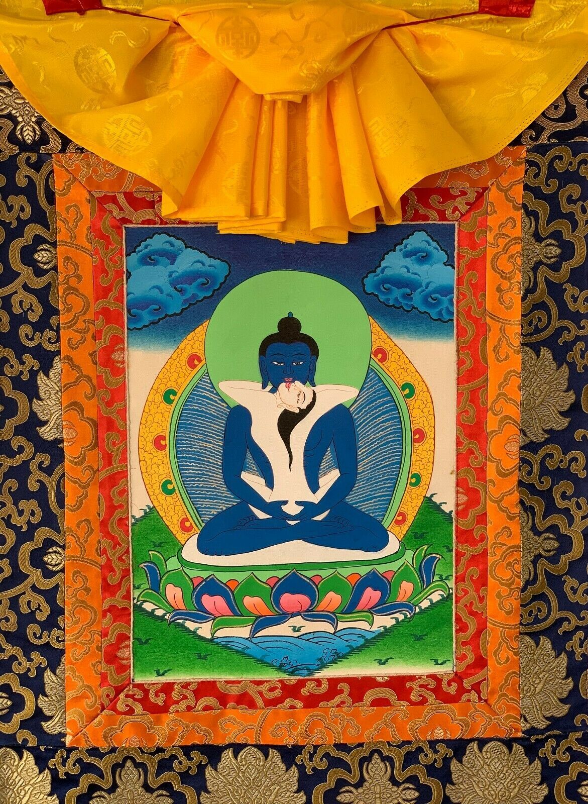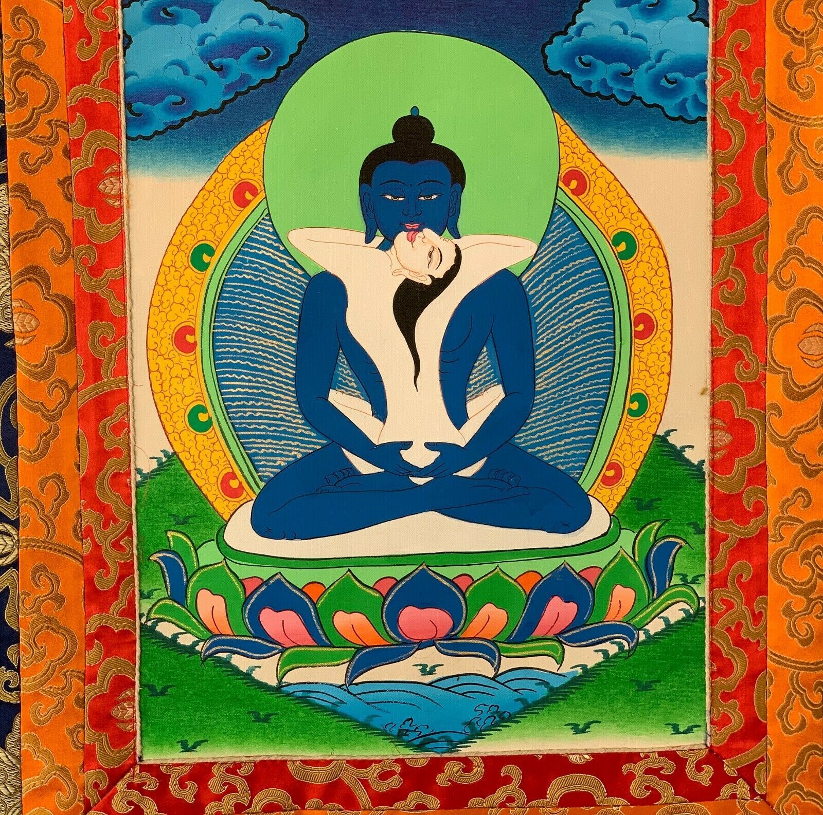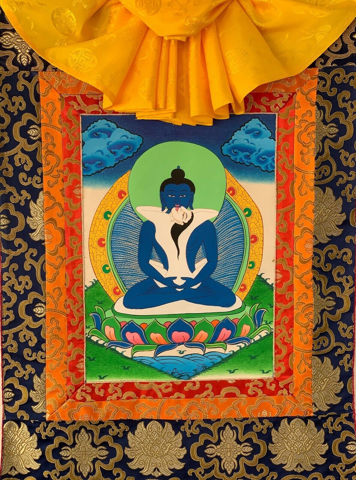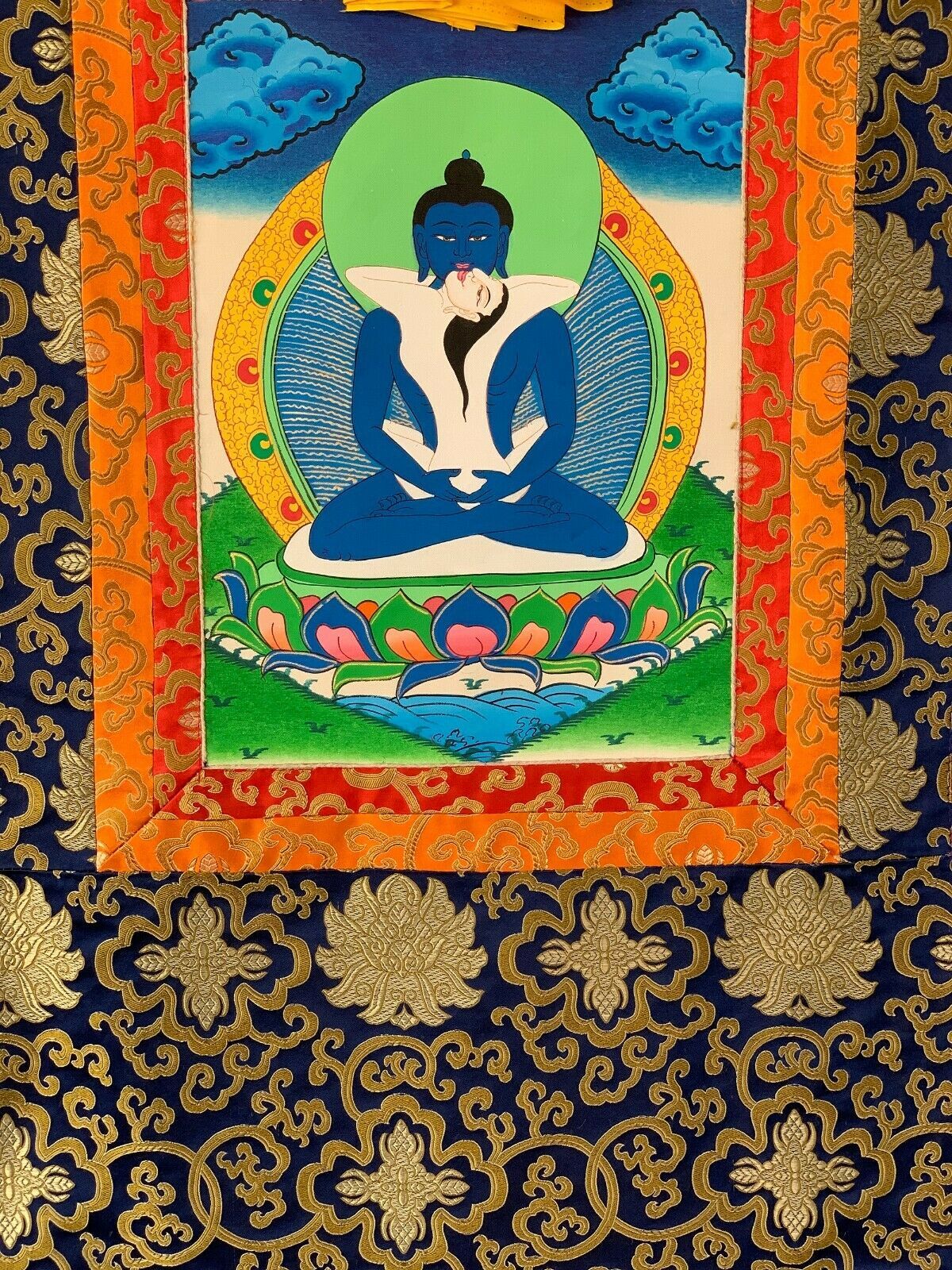 HAND-PAINTED SAMANTABHADRA TIBETAN THANGKA, THANKA PAINTING, WITH SILK BROCADE