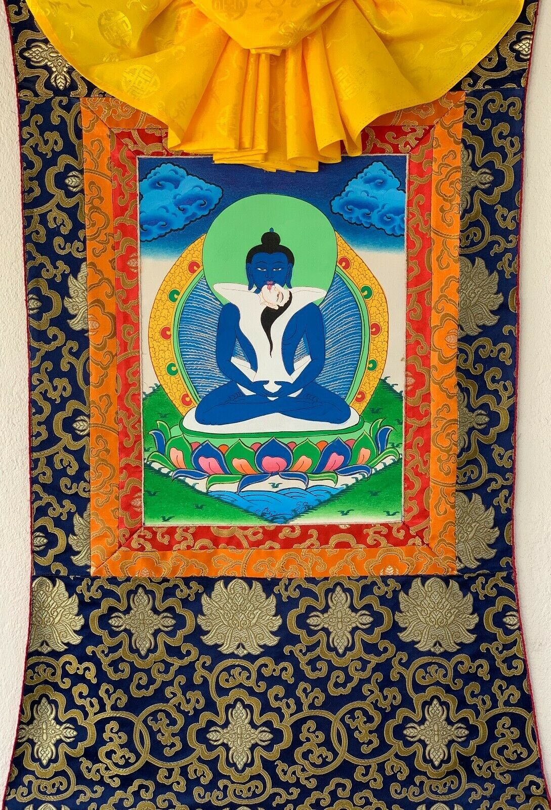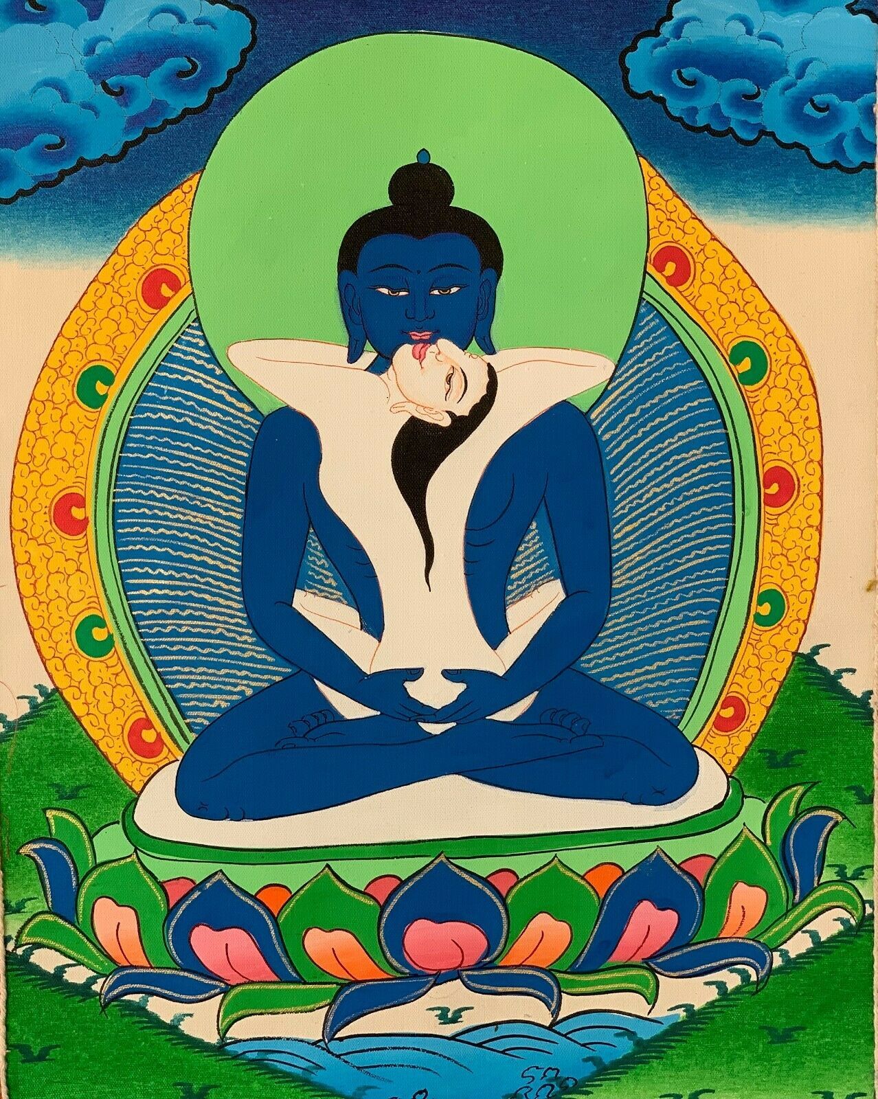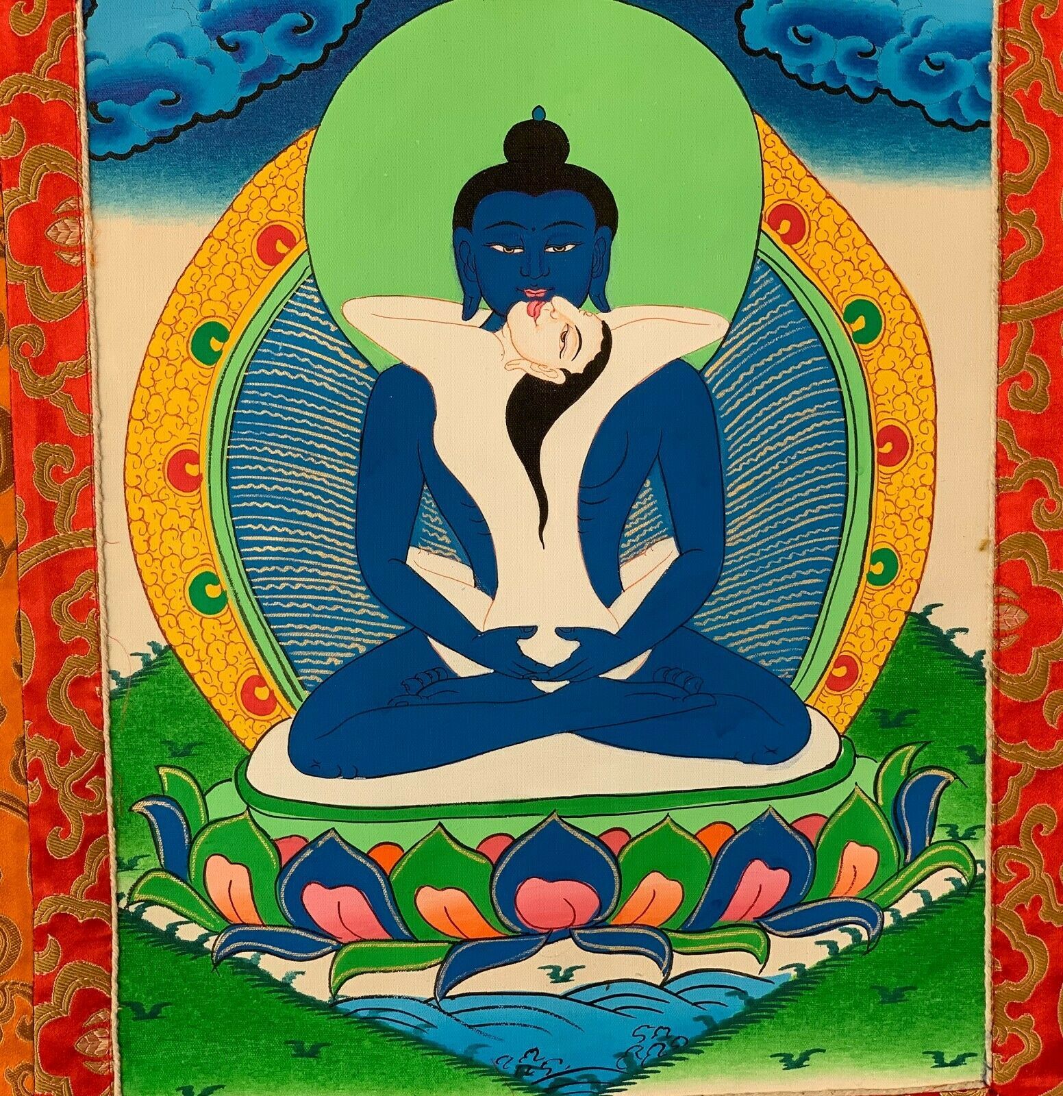 HAND-PAINTED SAMANTABHADRA TIBETAN THANGKA, THANKA PAINTING, WITH SILK BROCADE