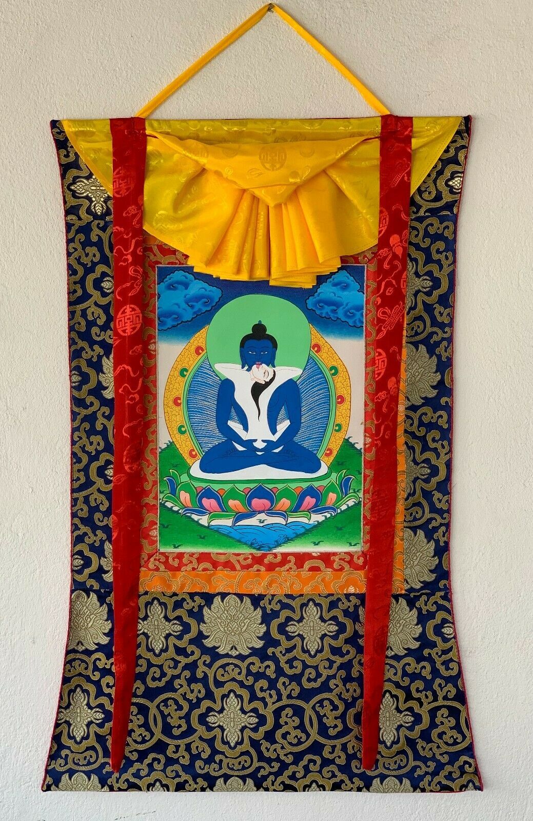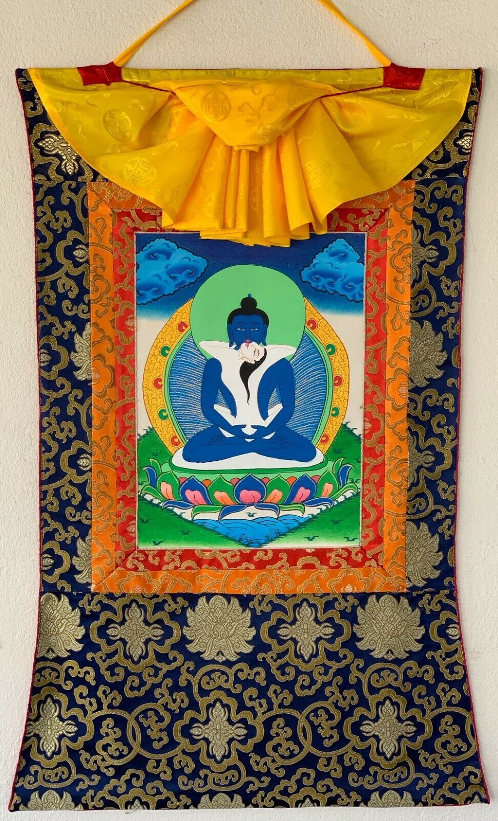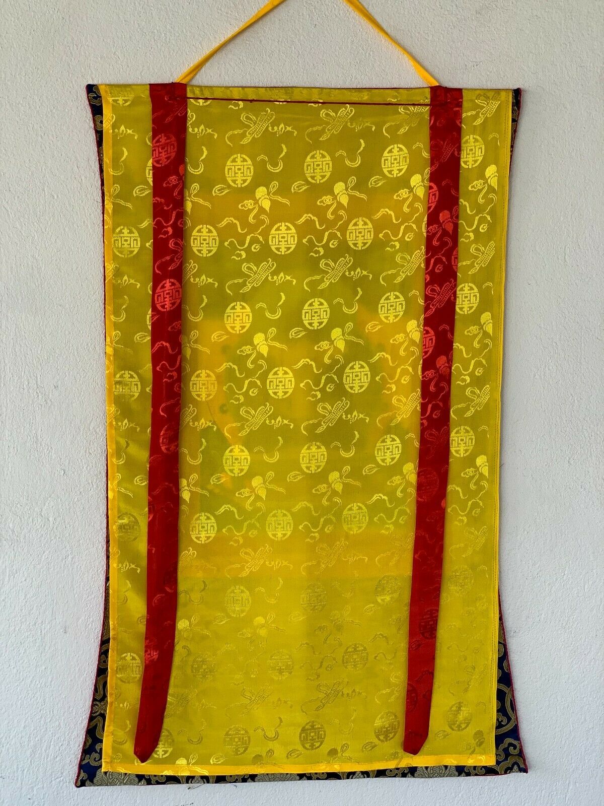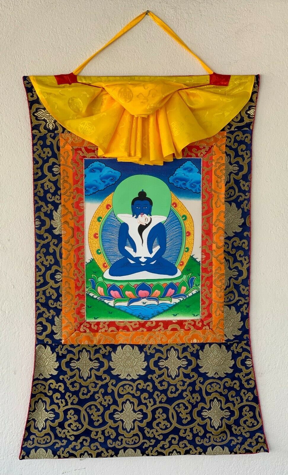 HAND-PAINTED SAMANTABHADRA TIBETAN THANGKA, THANKA PAINTING, WITH SILK BROCADE