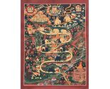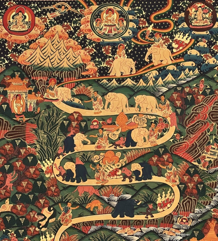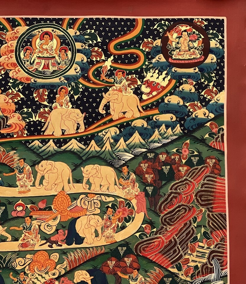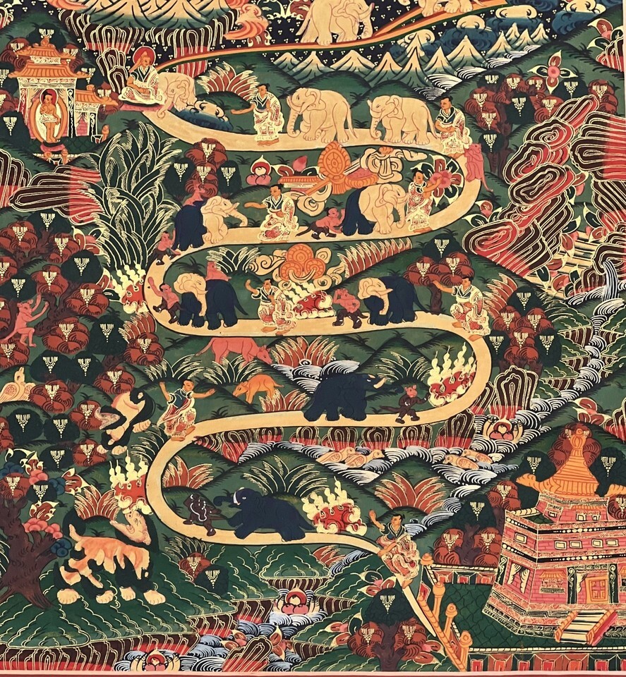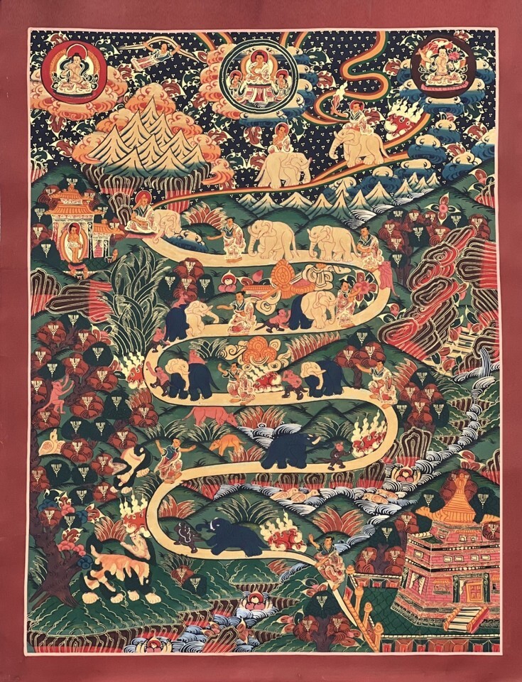 Experience the profound beauty of Tibetan Buddhist art with this original, hand-painted Thangka masterpiece. This sacred painting illustrates the Nine Stages of Samatha Meditation, also known as the Elephant Path Meditation ? a transformative journey toward mental clarity, tranquility, and enlightenment.