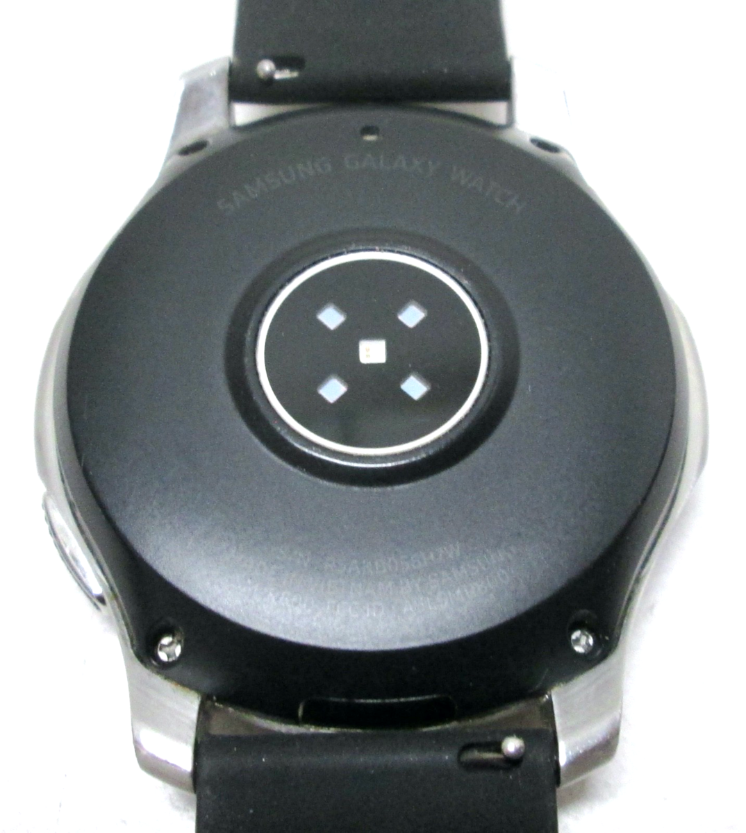 Samsung Galaxy Watch SM-R800 AMOLED Smartwatch 46mm Stainless Steel Case with Black Silicone Band. The watch has a clean screen and minor wear on the back. Includes new black silicone band and new replacement charger. Sold with free shipping.
