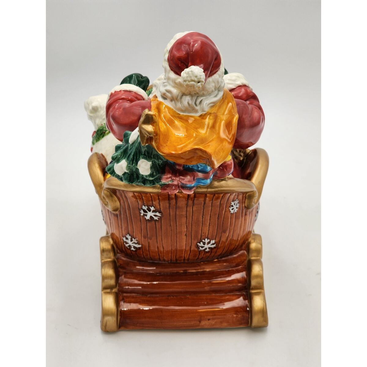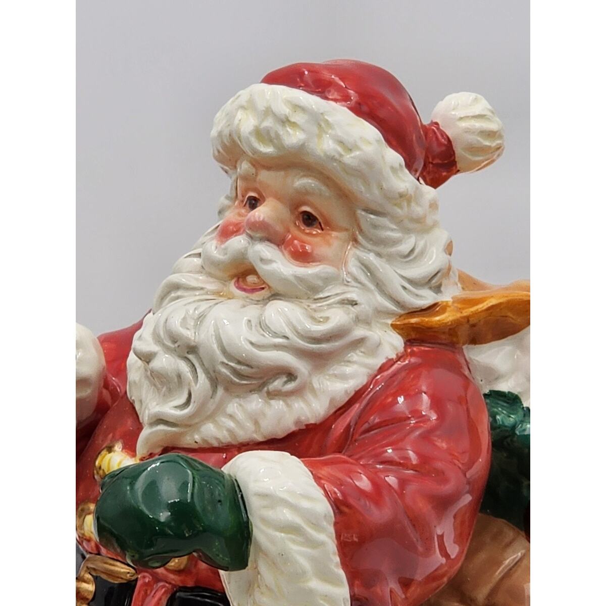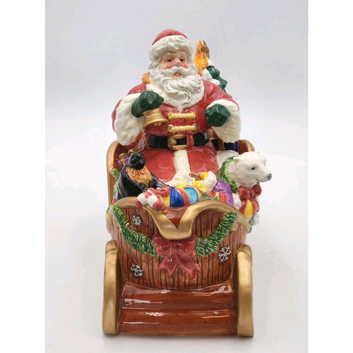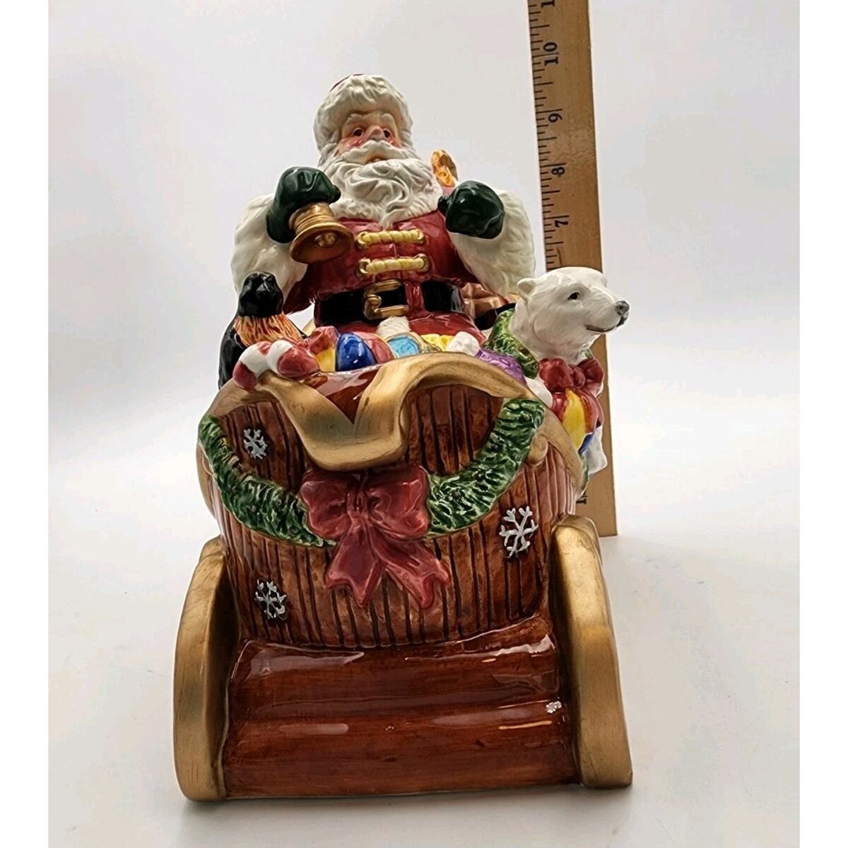 Elevate your festive decor with this beautiful vintage San Francisco Music Box Company Santa Claus Is Coming To Town Wind Up Sleigh. This large, glossy ceramic musical decor brings the spirit of Christmas into your home with a charming rendition of the classic song. Santa and his sleigh, adorned in vibrant multi-colors, mesure 10 inches in height, 12 inches in length, and 6 inches in width, making it a striking centerpiece or a perfect fit for a mantel or shelf. Ships Fast!
