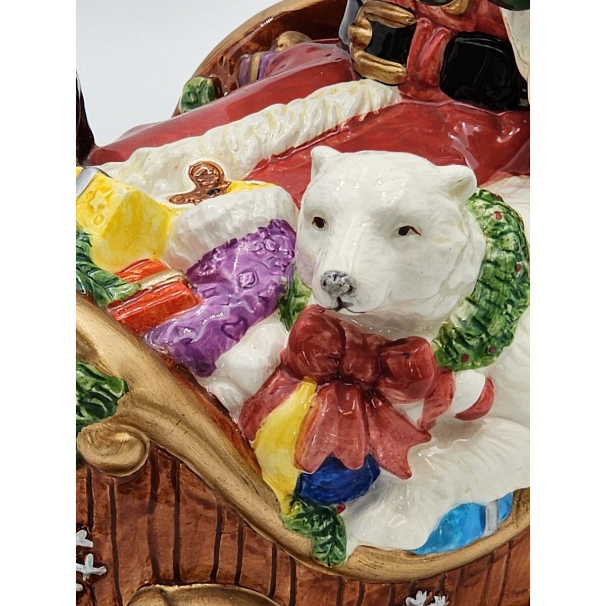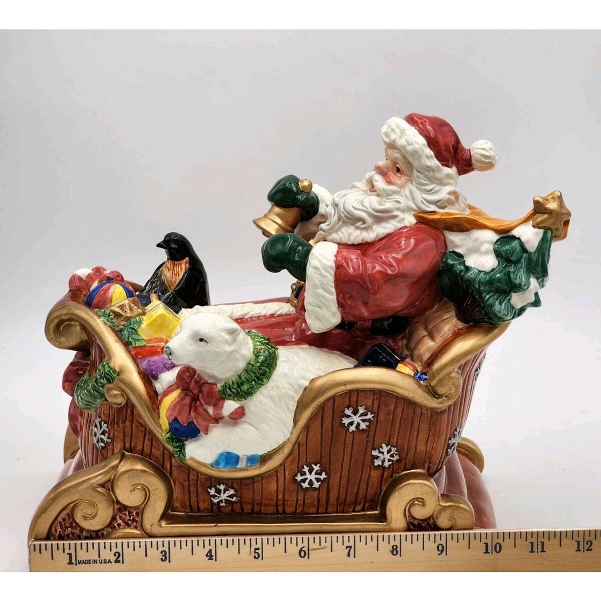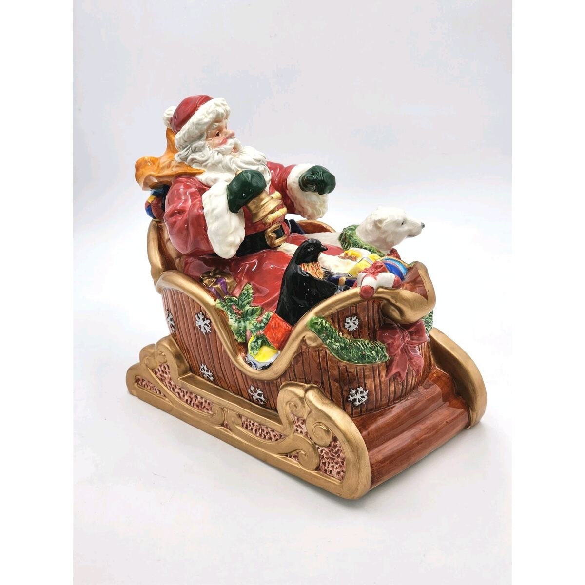 Elevate your festive decor with this beautiful vintage San Francisco Music Box Company Santa Claus Is Coming To Town Wind Up Sleigh. This large, glossy ceramic musical decor brings the spirit of Christmas into your home with a charming rendition of the classic song. Santa and his sleigh, adorned in vibrant multi-colors, mesure 10 inches in height, 12 inches in length, and 6 inches in width, making it a striking centerpiece or a perfect fit for a mantel or shelf. Ships Fast!