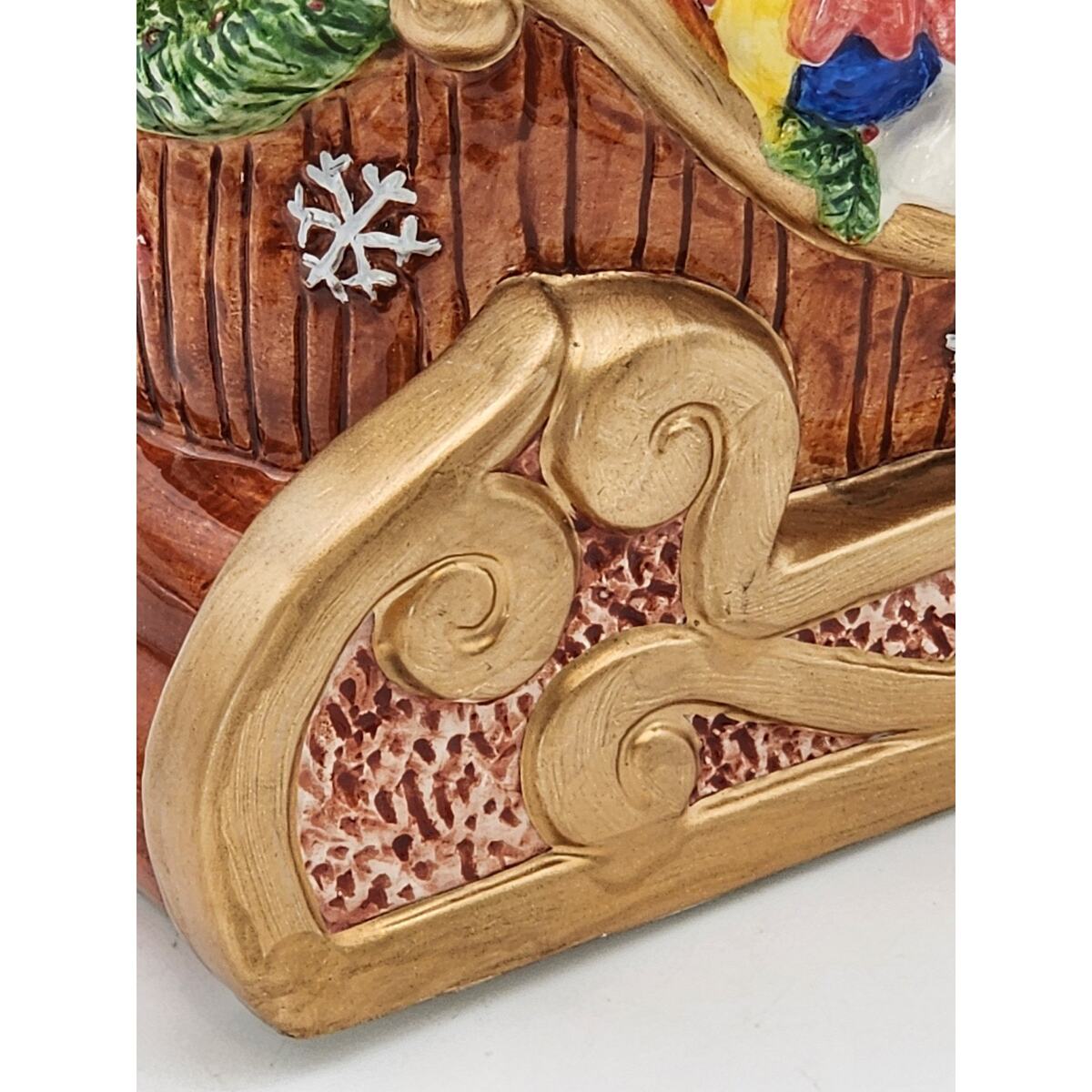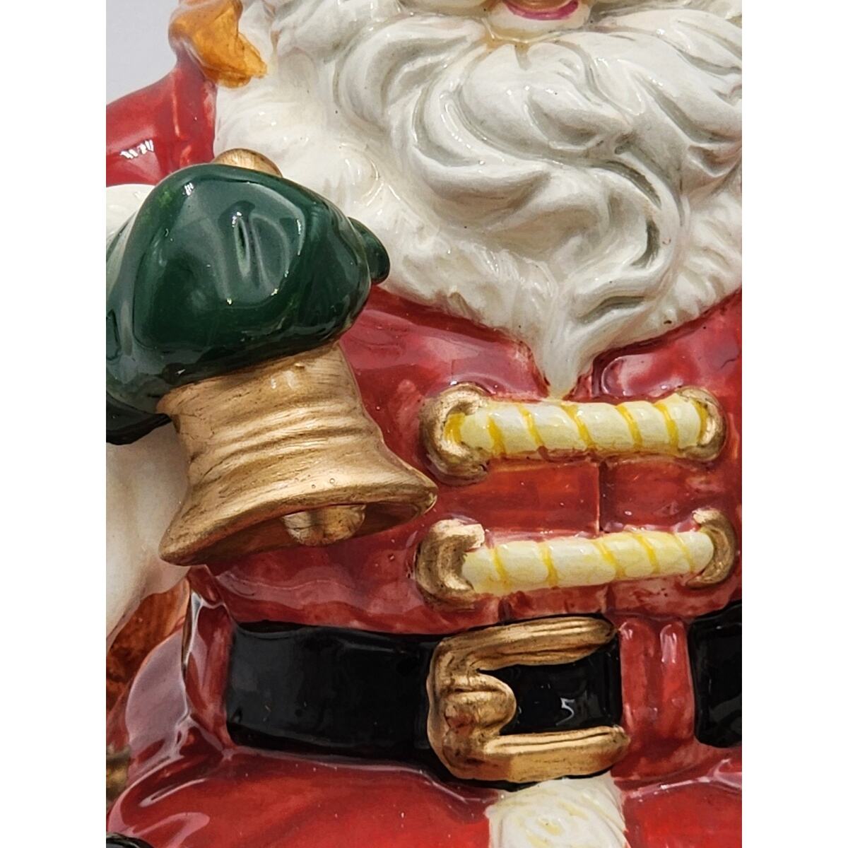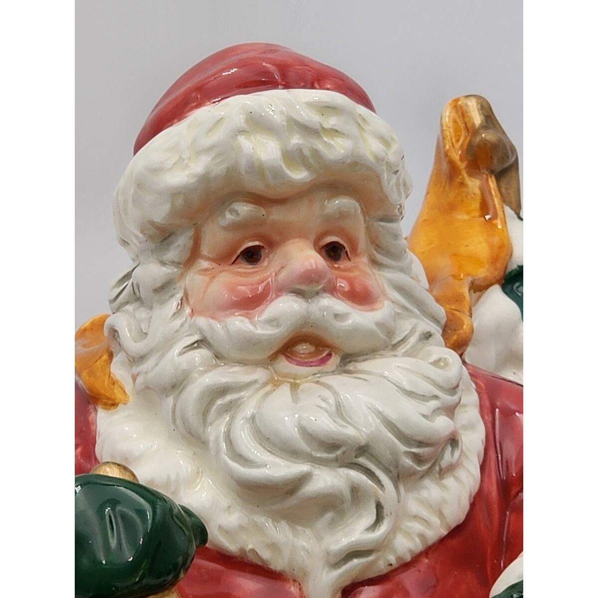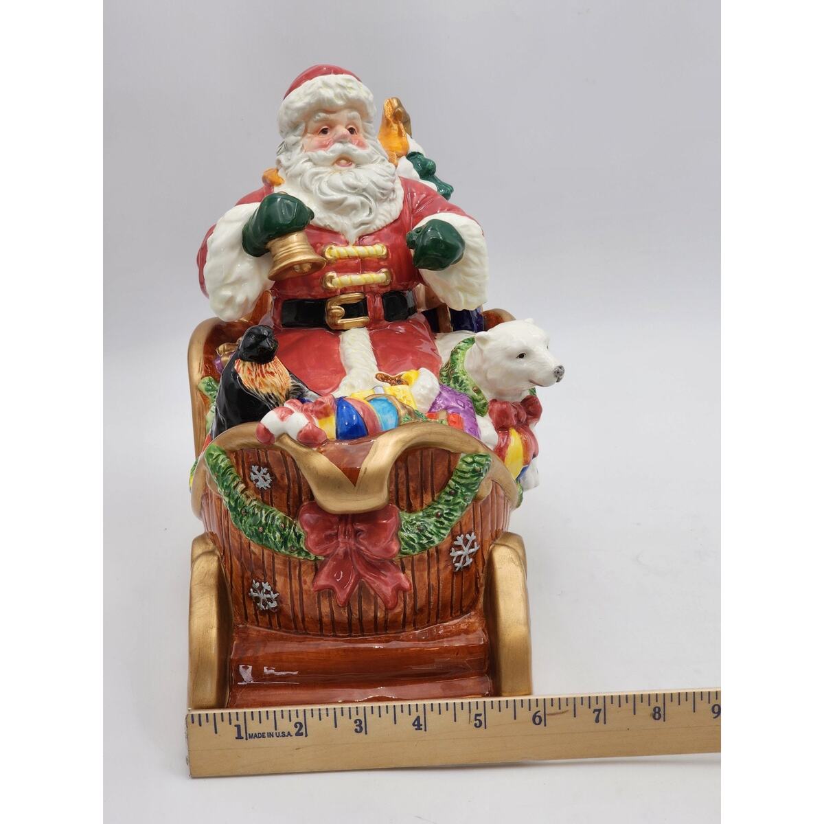 Elevate your festive decor with this beautiful vintage San Francisco Music Box Company Santa Claus Is Coming To Town Wind Up Sleigh. This large, glossy ceramic musical decor brings the spirit of Christmas into your home with a charming rendition of the classic song. Santa and his sleigh, adorned in vibrant multi-colors, mesure 10 inches in height, 12 inches in length, and 6 inches in width, making it a striking centerpiece or a perfect fit for a mantel or shelf. Ships Fast!