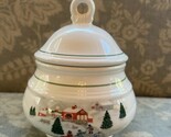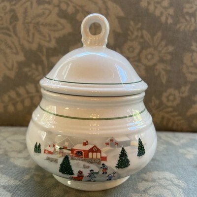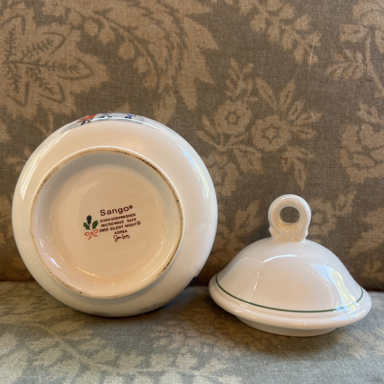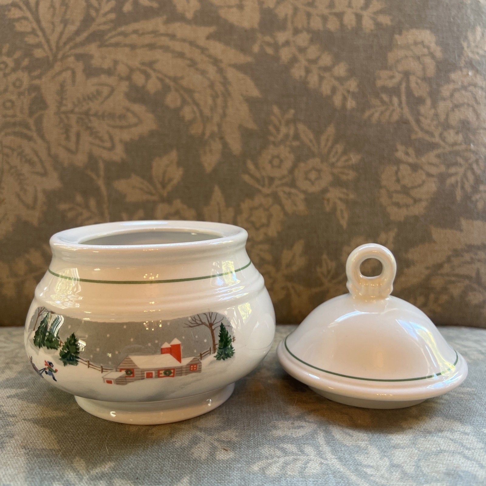Sango Silent Night covered sugar bowl. This pattern, also known as Sango Silent Night 3900, is a discontinued holiday china set featuring a winter village scene.