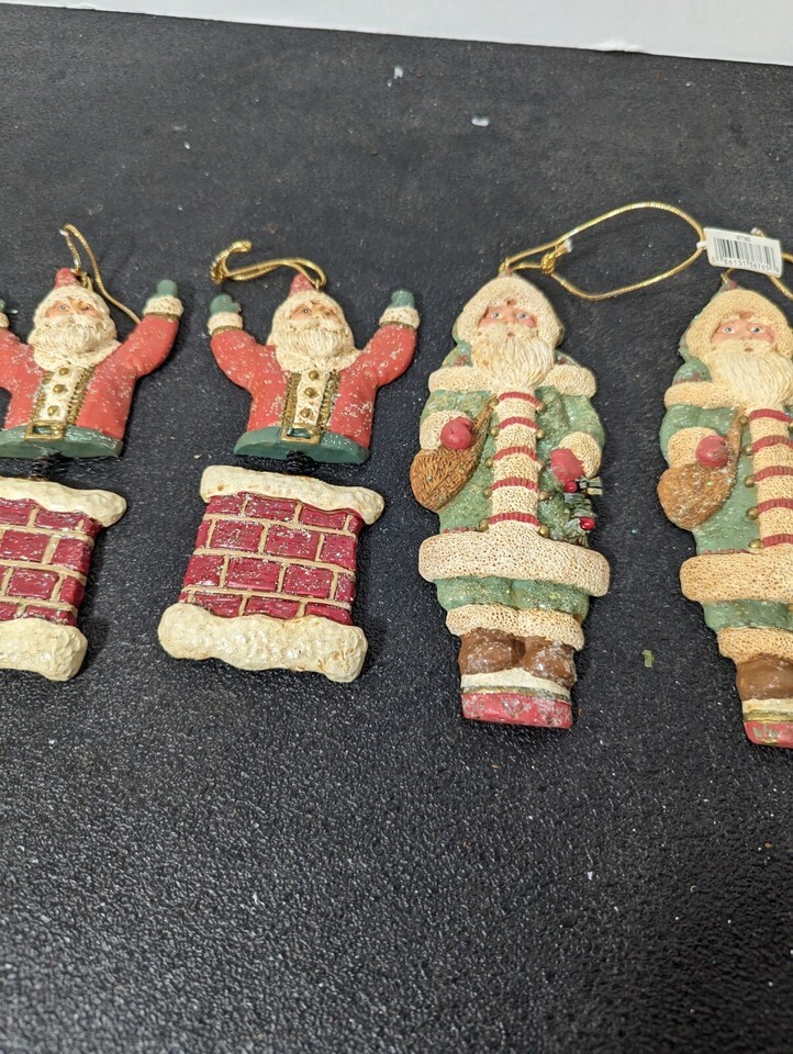 Two each of 2 different Santa ornaments. One pair is old world Santa the other pair is Bobblehead Santa in chimney