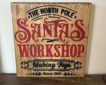 Crafted from durable wood with a rustic finish, it features classic red and black lettering that reads "The North Pole Santa's Workshop Making Toys Since 1936."