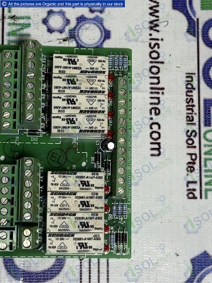This is an 8-channel relay module board, a versatile component for control and automation systems. It features eight high-quality Schrack V23061-A1007-A302 relays, allowing for independent switching of multiple circuits. Identified by the board part number 00204916 A, this module is ideal for use in industrial control panels, robotics, and other electronic projects.