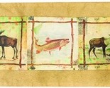 Perfect table runner for you cabin retreat or if you just want your table to have an outdoor theme. This 72 inch table runner has richly colored scenes of fish, moose, and elk. Each scene outlined with wood looking borders and set against a unique multicolored design background. Tan colored material forms a border running the length of the table runner. It is 72 inches long and is lined in dark brown. Use this one of a kind table runner on your dining room or kitchen table or on your sideboard or sofa table. Dry or spot clean only.