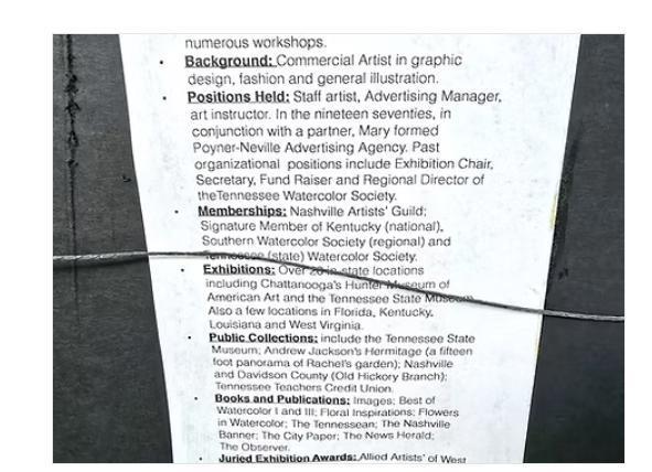 M. Neville (1932-2024), a popular artist, native of W. Virginia, was educated at W. Virginia University and School of Design. She worked as a commercial artist in New York City graphic design, fashion and general illustration; she has held positions as advertising manager and art instructor giving workshops and teaching privately throughout the South. Based in Nashville middle Tennessee, her paintings of mostly watercolors, sketches and oil on canvas are included in private and public collections including the Tennessee State Museum and historic venues such as Andrew Jackson’s Hermitage. M. Neville held many prominent arts positions: Board member of the Madison Art Center, Tennessee Watercolor Society (Regional Director, Secretary, and Exhibition Chair), a member of the Nashville Artist Guild and a signature member of the Kentucky, Southern, and Tennessee Watercolor Societies.