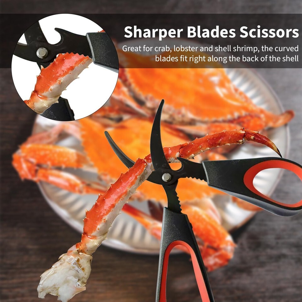 USE ENVIRONMENT: Stainless steel shellfish scissors are razor sharp and cut through tough crab shells and lobster legs to deftly open crabs and lobsters; food-grade, lightweight plastic shell opener cracks open and peels off all crab legs and claws