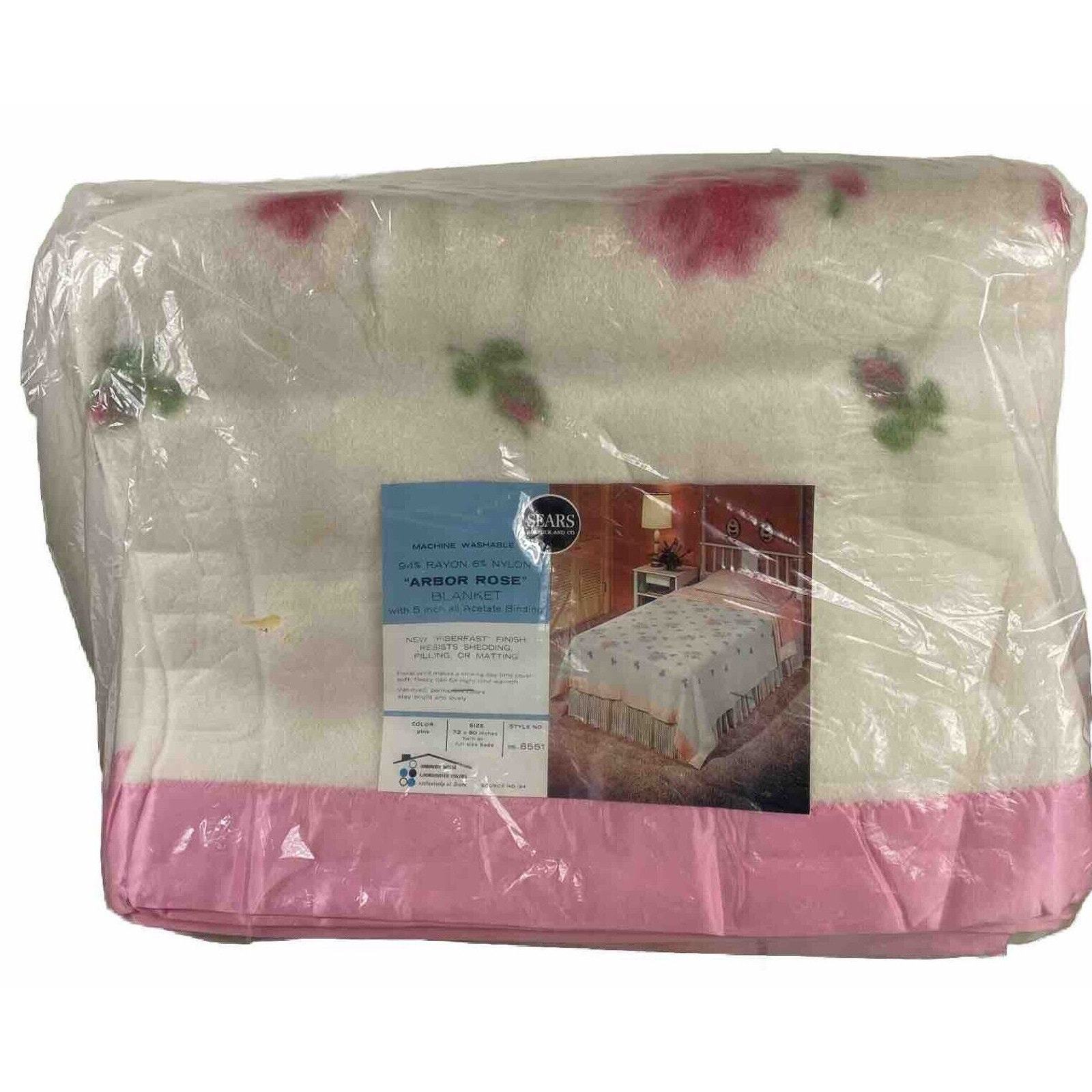 - Sears Riviera Rose Pink Floral Acrylic Twin Blanket with Satin Trim – NOS 1970s