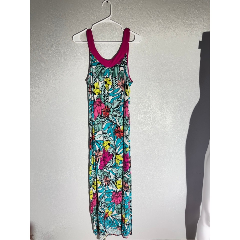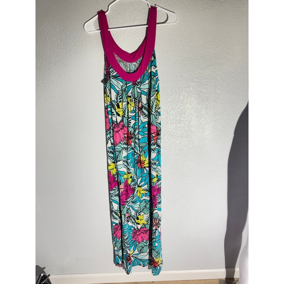 Stay cool and stylish in this soft and flowy Secret Treasures nightgown. Designed in a vibrant tropical floral print with a fuchsia pink neckline, this sleeveless maxi dress is perfect for lounging or warm-weather sleepwear. Soft rayon-spandex blend adds stretch and comfort.