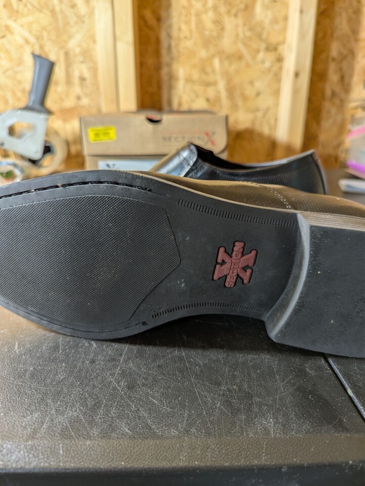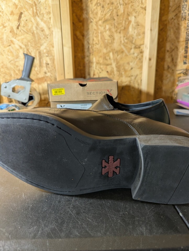 Elevate your style with Section X black leather dress shoes in size 10.5. Tailored for the discerning gentleman, these shoes feature a classic almond toe shape and a sleek, solid pattern that effortlessly complements any ensemble. The versatile black hue and premium leather upper make them an ideal choice for a variety of occasions, from formal events to business meetings.