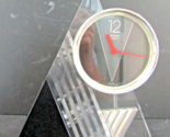 The Seiko 1980s Black and Clear Acrylic Pendulum Desk Clock is a vintage piece with a retro style, perfect for adding a touch of nostalgia to any room. Made from acrylic, this triangle-shaped clock features a clear and black color scheme, reflecting the fashion trends of the late 20th century. Powered by a battery-operated quartz movement, this desk clock from Japan is both functional and decorative, making it a unique and original collectible for enthusiasts of vintage timepieces. Very rare. Thick acrylic. Pendulum under the dial. AA battery operated. Made in Japan in the 1980s. No chips or cracks.