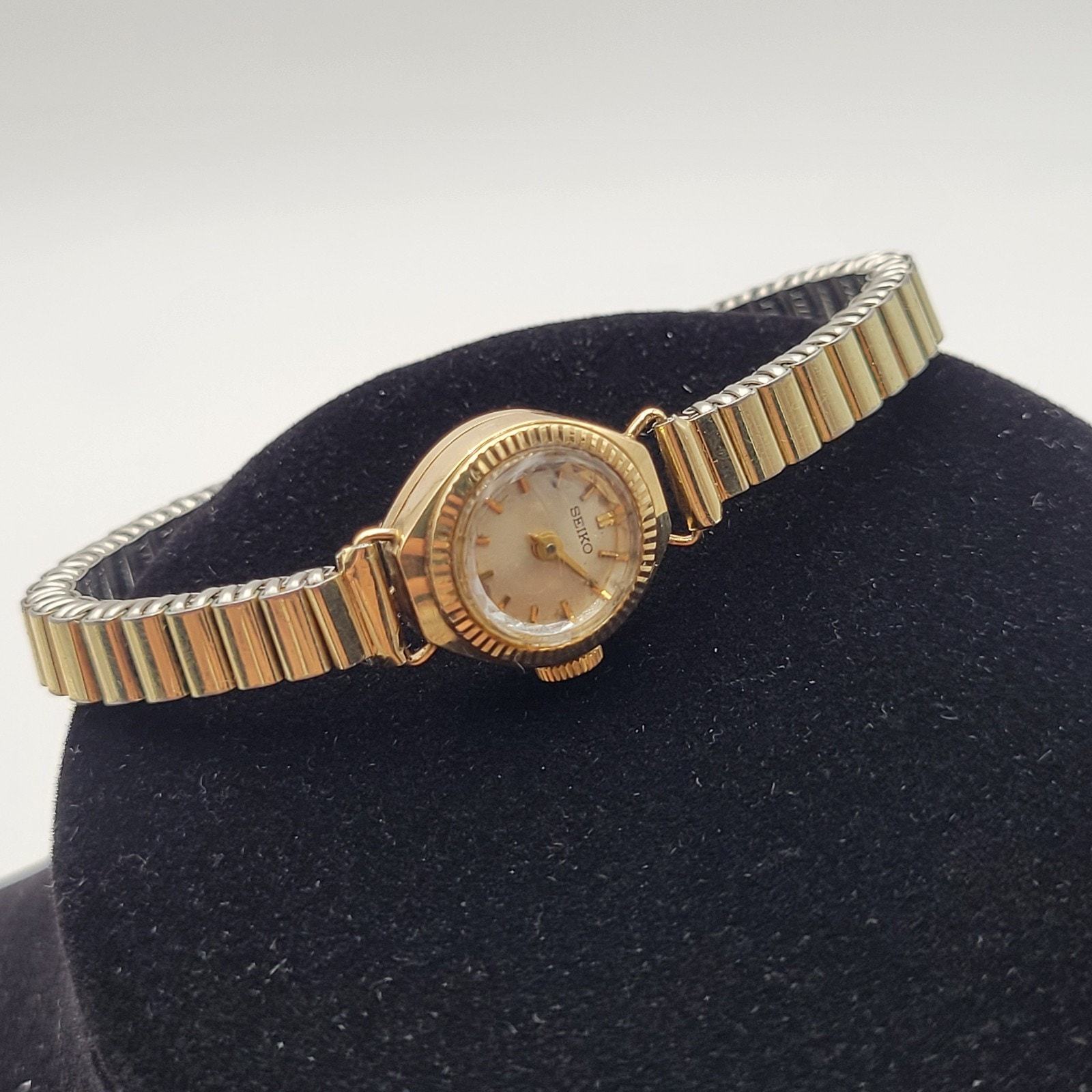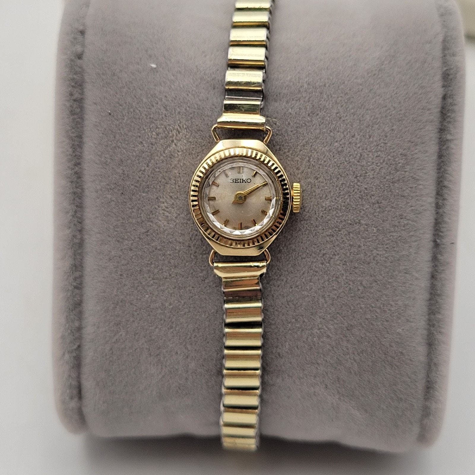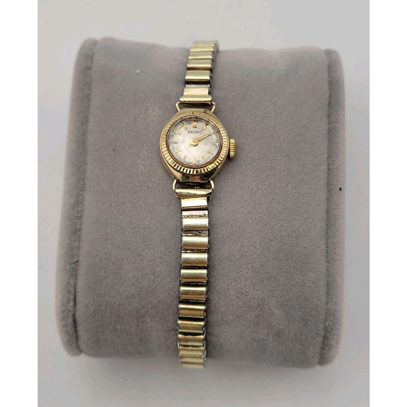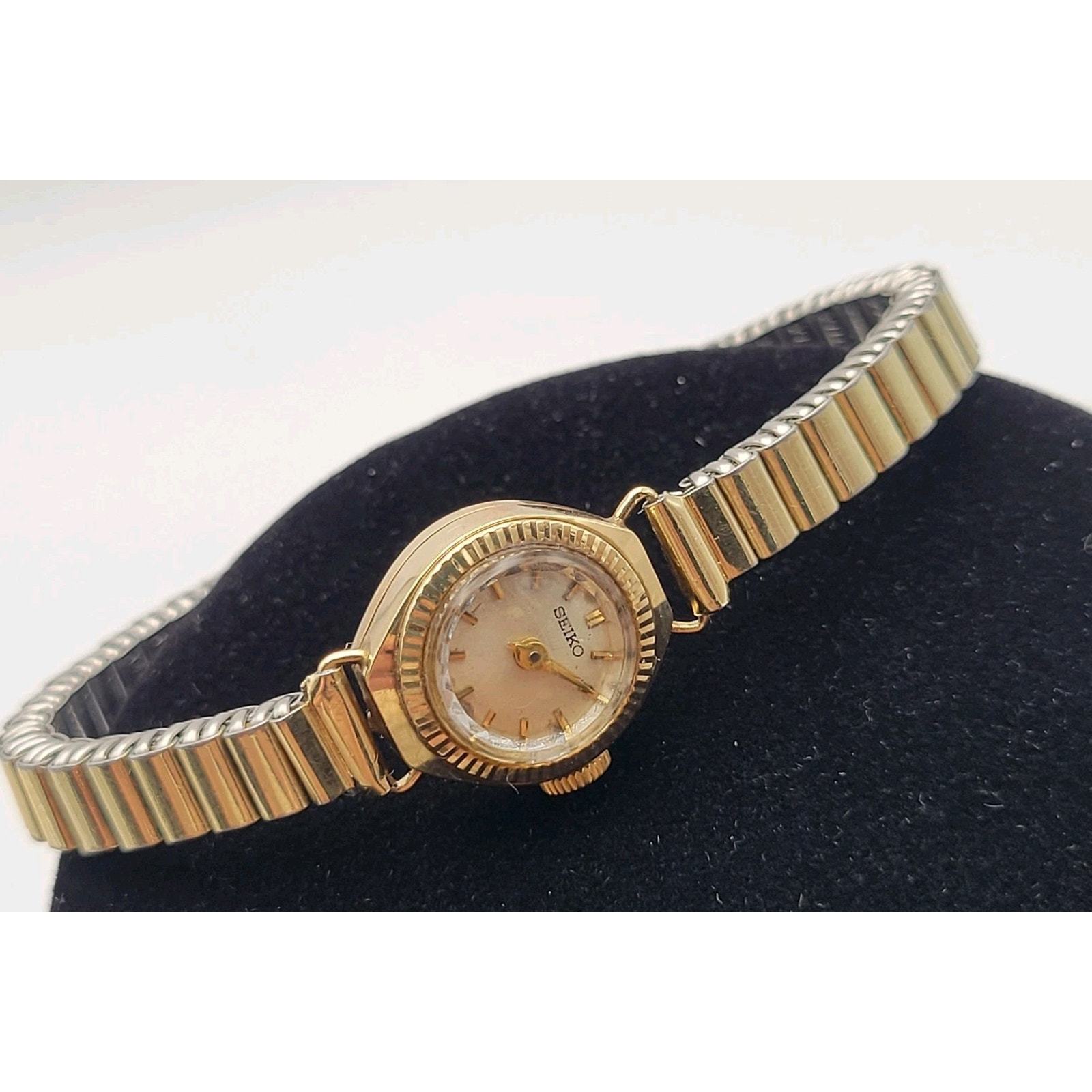 This Seiko women's watch features a vintage design with a white dial and gold plated case and bracelet. The manual wind movement with 17 jewels and sunburst dial pattern add to its classic style. The round case with stick and baton indexes, acrylic crystal, and 12-hour dial give it a timeless look that can be worn for both dressy and casual occasions. Made in Japan, this Seiko watch is a unique and elegant accessory for any woman's collection.