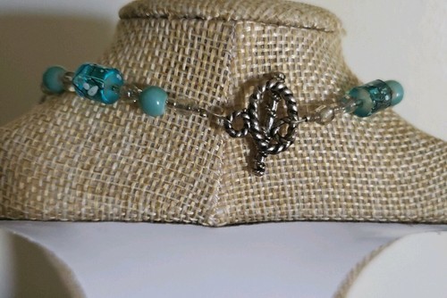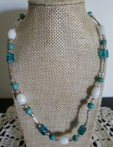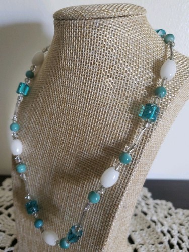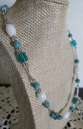 Shades of Blue, Jade, Turqoise, White, Clear Semi-Precious Beads Throughout Between Clear Spacers