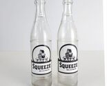 This pair of vintage soda bottles are for Squeeze and features a black white front graphic. The backside indicates it was bottled under licensed by the National Fruit Flavor Company of New Orleans USA by Coca-Cola bottling. The bottle is made of clear glass with black and white ACL labeling.