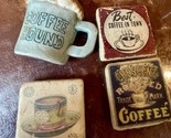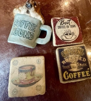The product is a set of 4 vintage stone coffee refrigerator magnets.