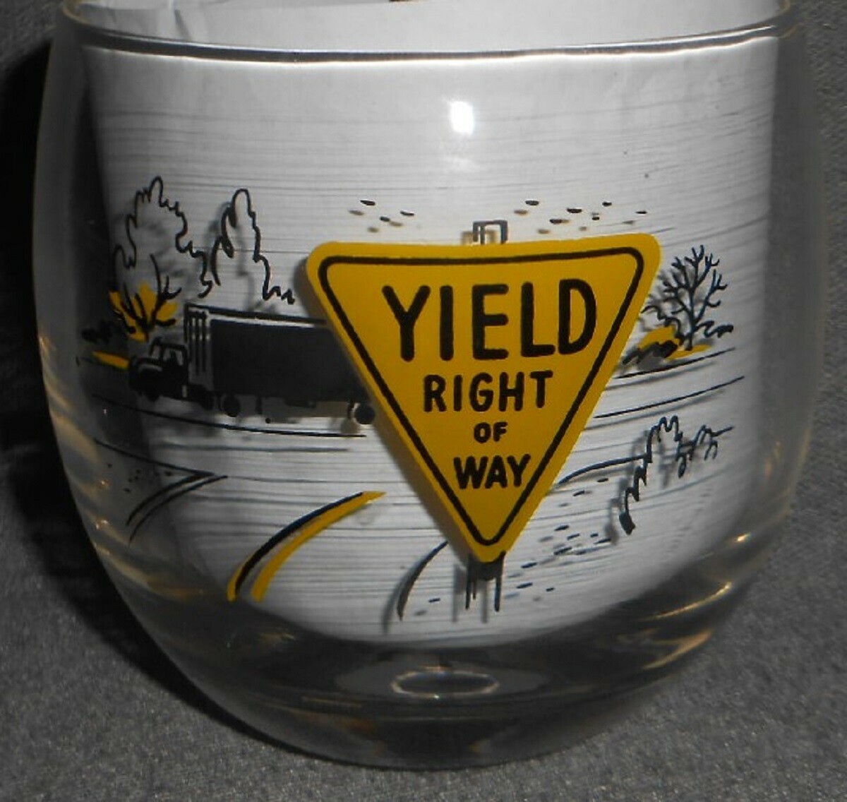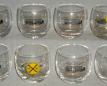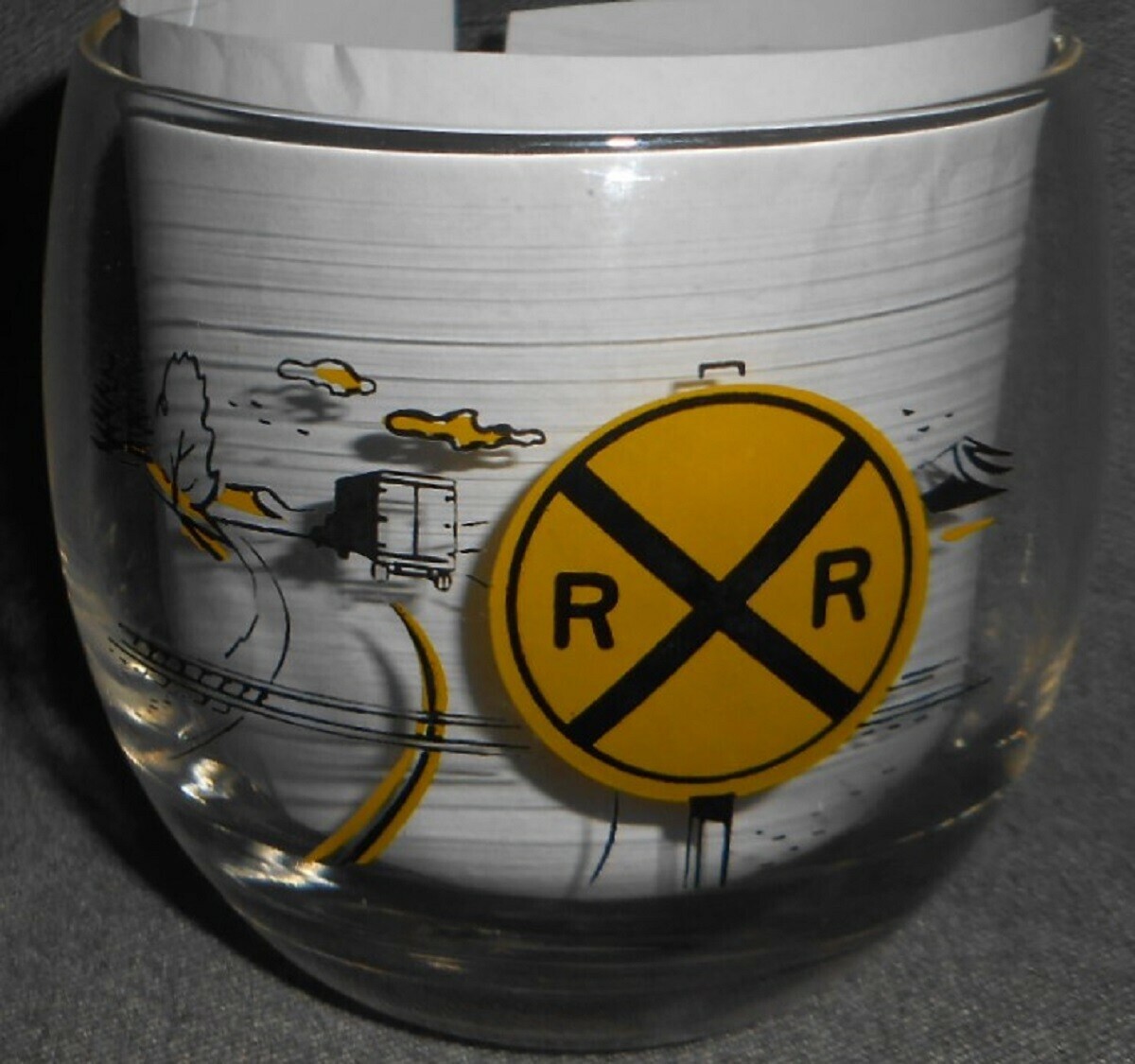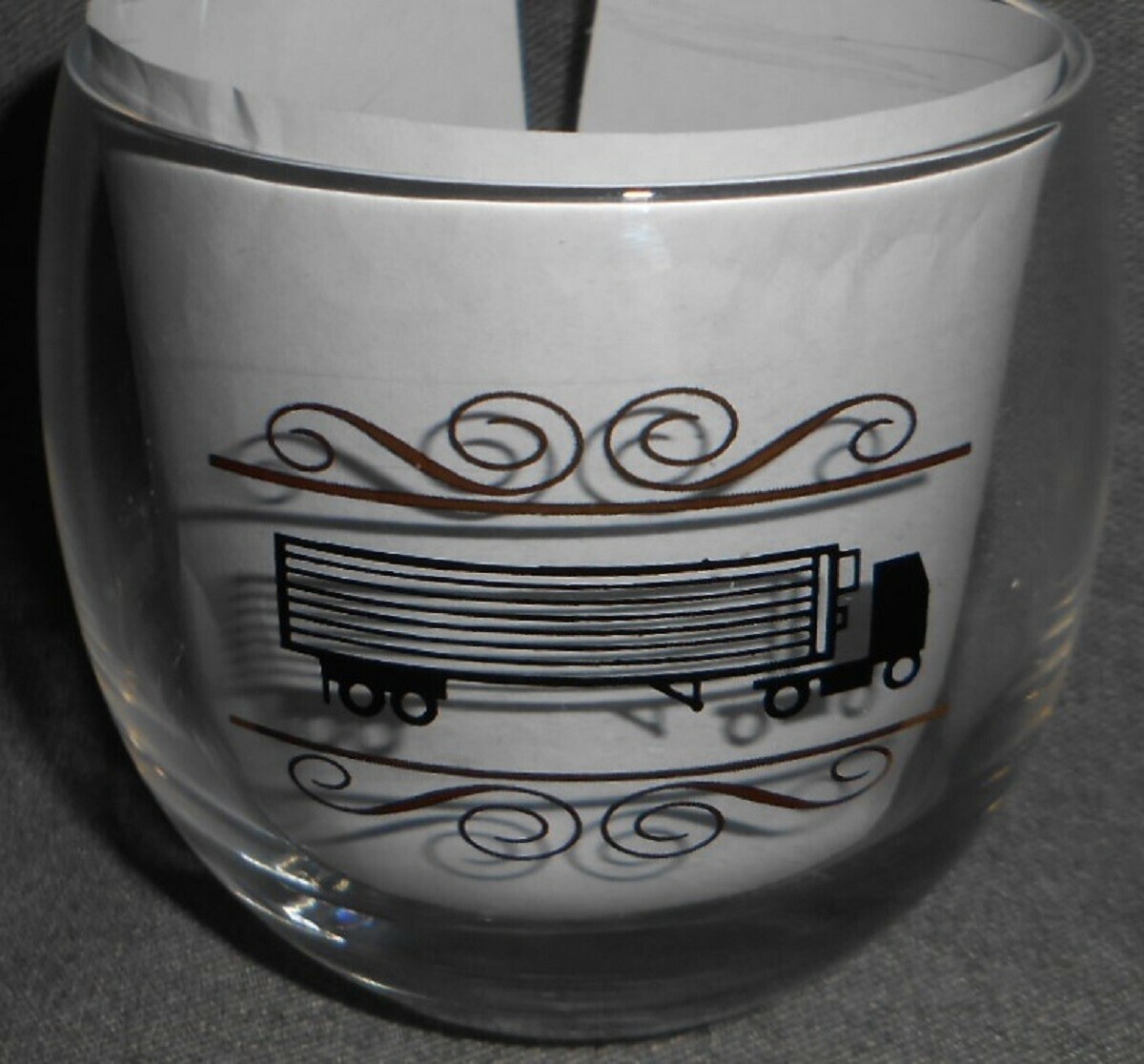 This is a Rare Set that depict eight different Big Rigs - Trucking Theme - Road Signs - in Black and Gold and Yellow Graphics - a Set of (8) 3 1/8" tall 10 oz Roly Poly Bar Tumblers. They are all in good pre-owned condition with no chips or cracks - a few minor/light scratches from use present but otherwise look as though they were rarely or never used - great graphics!****The glass and graphics are clear and well defined in person - the shadows from the backside of the graphics make them appear otherwise in some of the photos****
