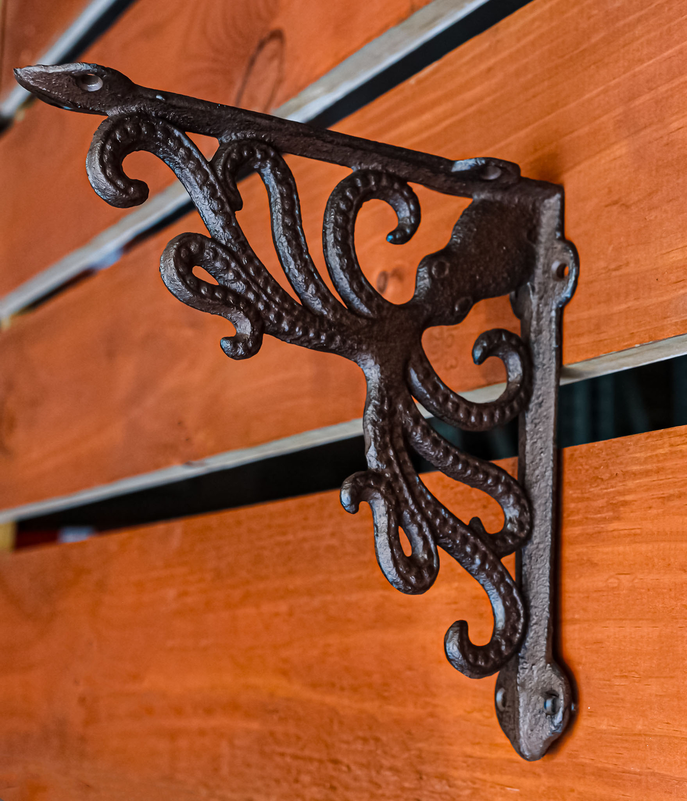 ? This Ocean Themed Octopus Cast Iron Shelf Bracket can be used to Craft DIY Custom Shelves, hold up mailboxes or in the corner of doorways as decorations. The Octopus pattern makes this bracket perfect for your beach house. The Antique Maritime Style coupled with a Distressed Brown Coloring gives this wall bracket a vintage appeal.