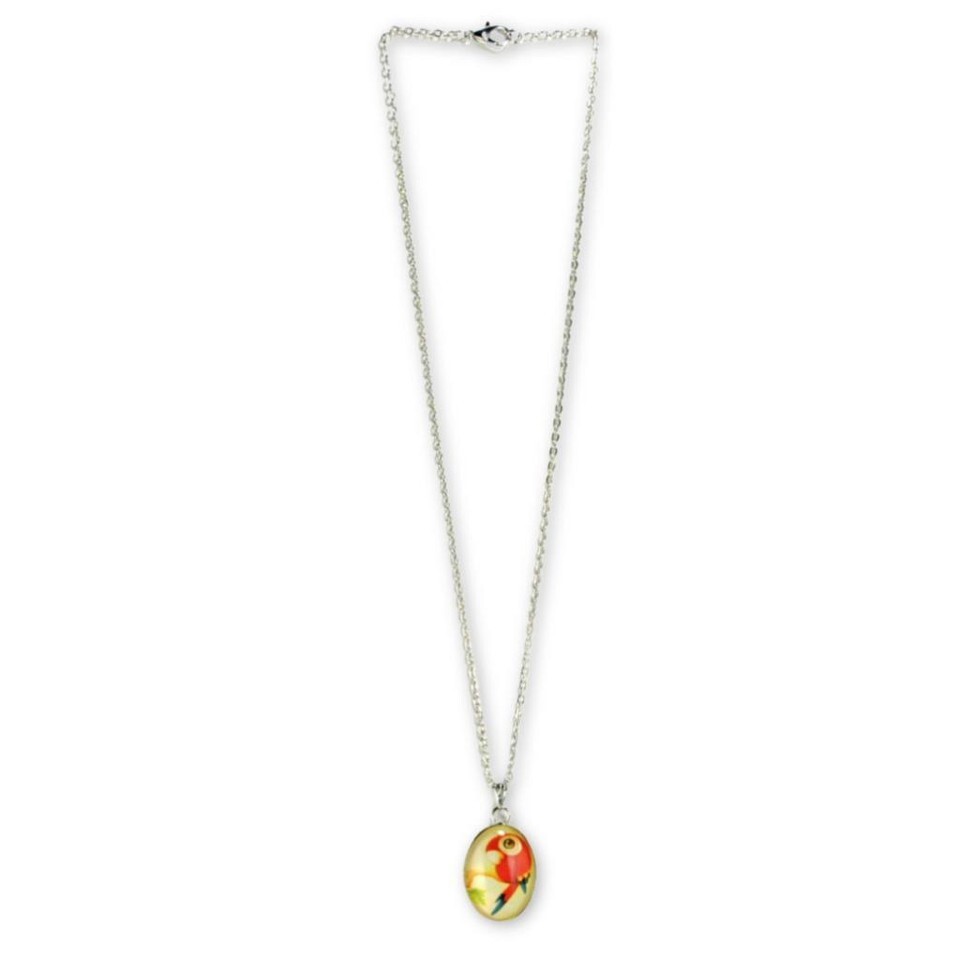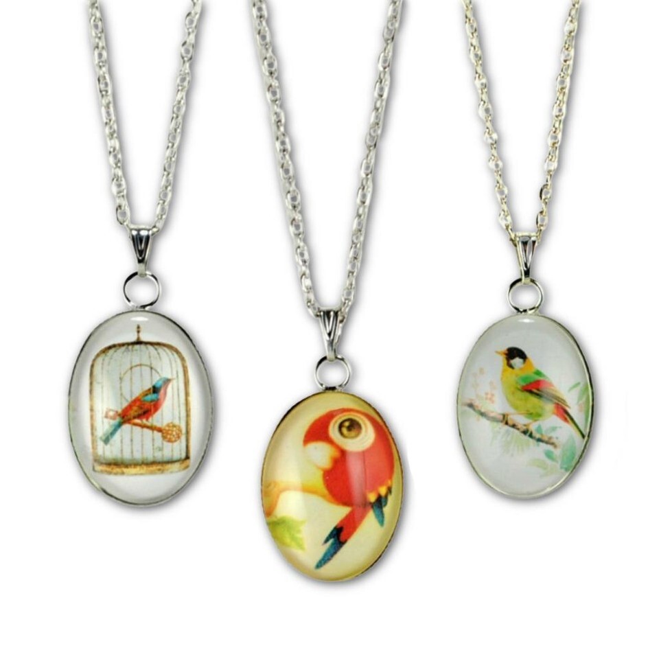 This set of 3 playful bird themed necklaces feature a colorful oval pendant strung on a 17" metal chain (8.5" hang) with clasp.