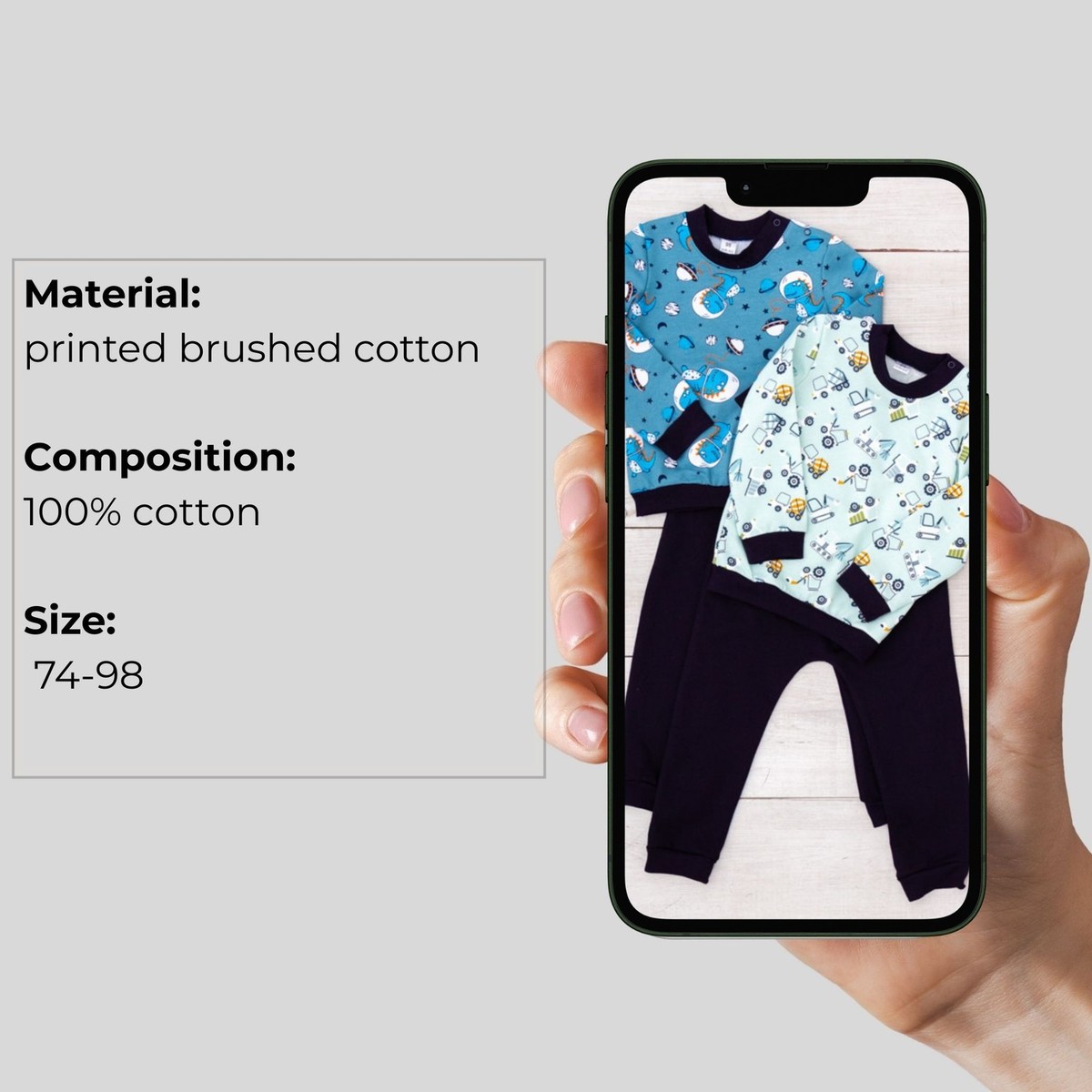 A warm and soft set consisting of a sweatshirt and pants provides comfort and freedom of movement during sleep or play. The brushed cotton with a gentle fleece inside retains warmth well, feels pleasant on the skin, and does not cause irritation. The printed design makes the set bright and cheerful. Perfect as pajamas or homewear, it keeps its shape and color even after frequent washing.