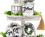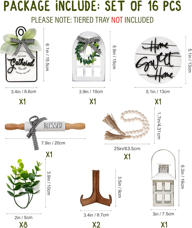 FARMHOUSE TIERED TRAY DECOR SET of 16: Houmury tiered tray decor set will come with set of 16: Lantern*1, Home Sweet Home Sign*1, Cutting Board Gathered Sign*1, Blessed Mini Rolling Pin*1, Cathedral Arch Window*1, Easel*2, Artificial Plant*8, wooden bead garland with tassel. Please note, the tiered tray is not included.