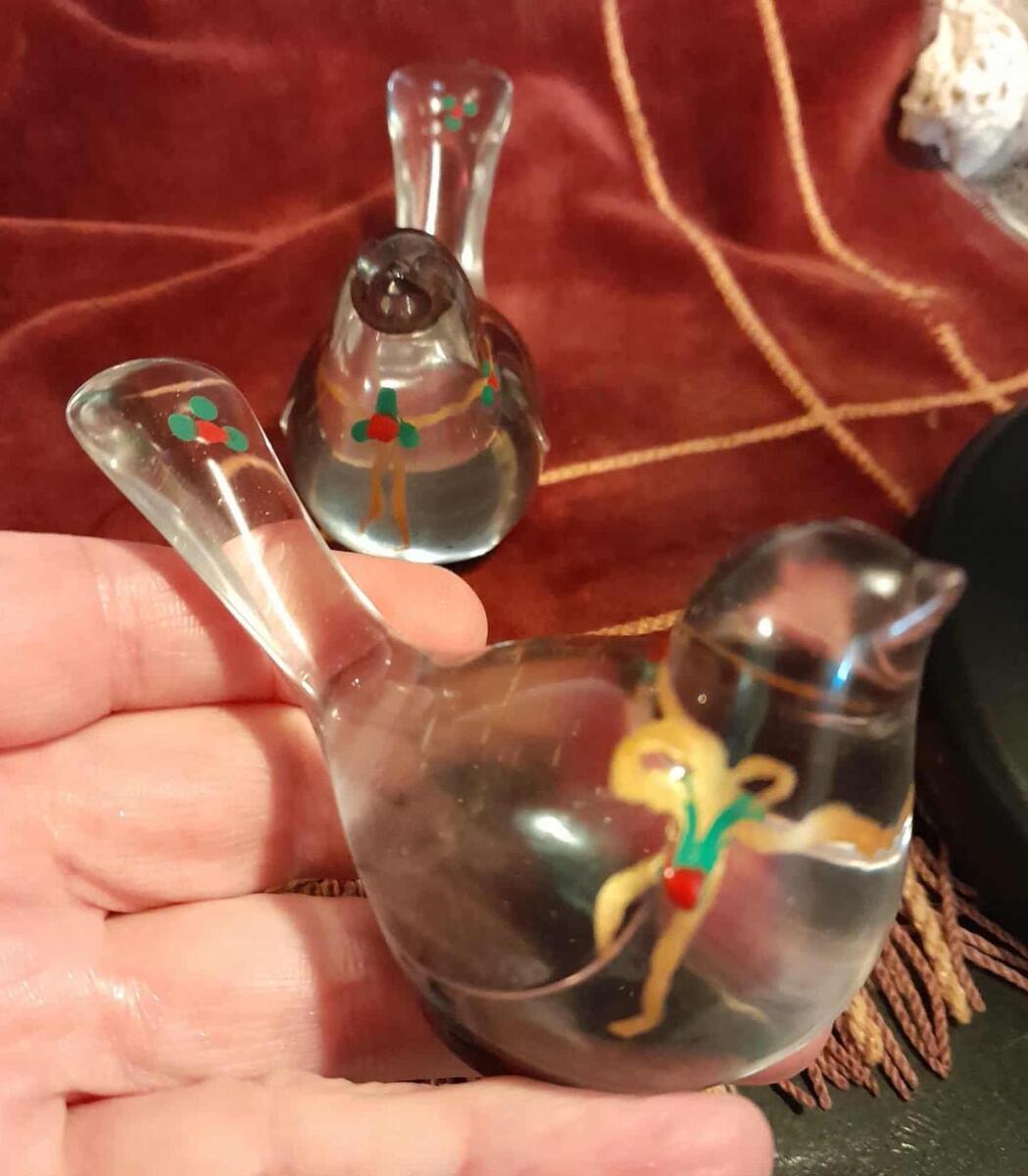 Set of 2 Holiday Christmas Birds, wispy clouded effect that is so very cool on these birds. Would be great to incorporate into your Holiday decor, table decorations, mantles, etc. Lovely and unique. Made of resin.