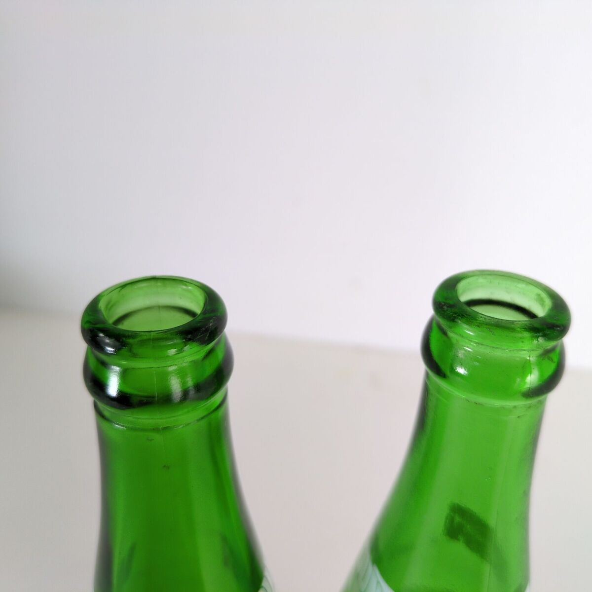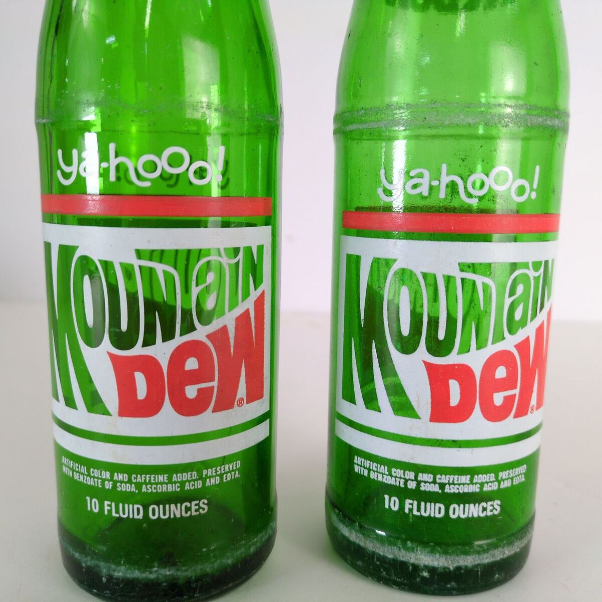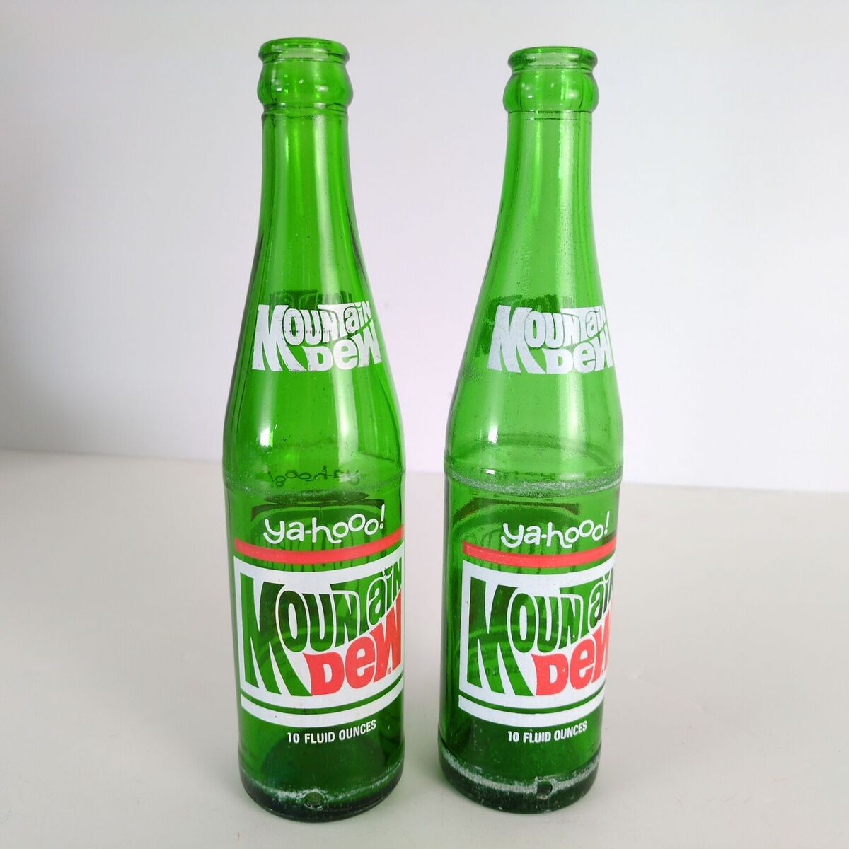- Set of 2 Vintage Mountain Dew Ya-hooo! ACL 10oz Green Glass Soda Bottles 1970s