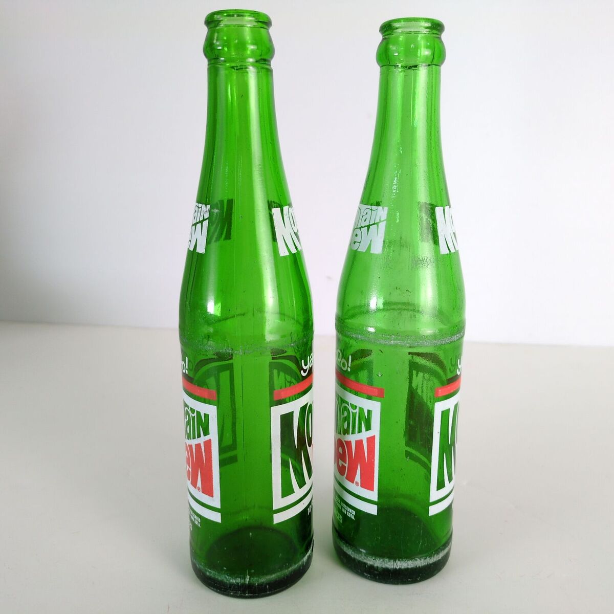 This set of two vintage Mountain Dew soda bottles feature green glass with red and white ACL graphics. They have the old ya-hooo! slogan. I believe they date from 1970 1972.