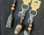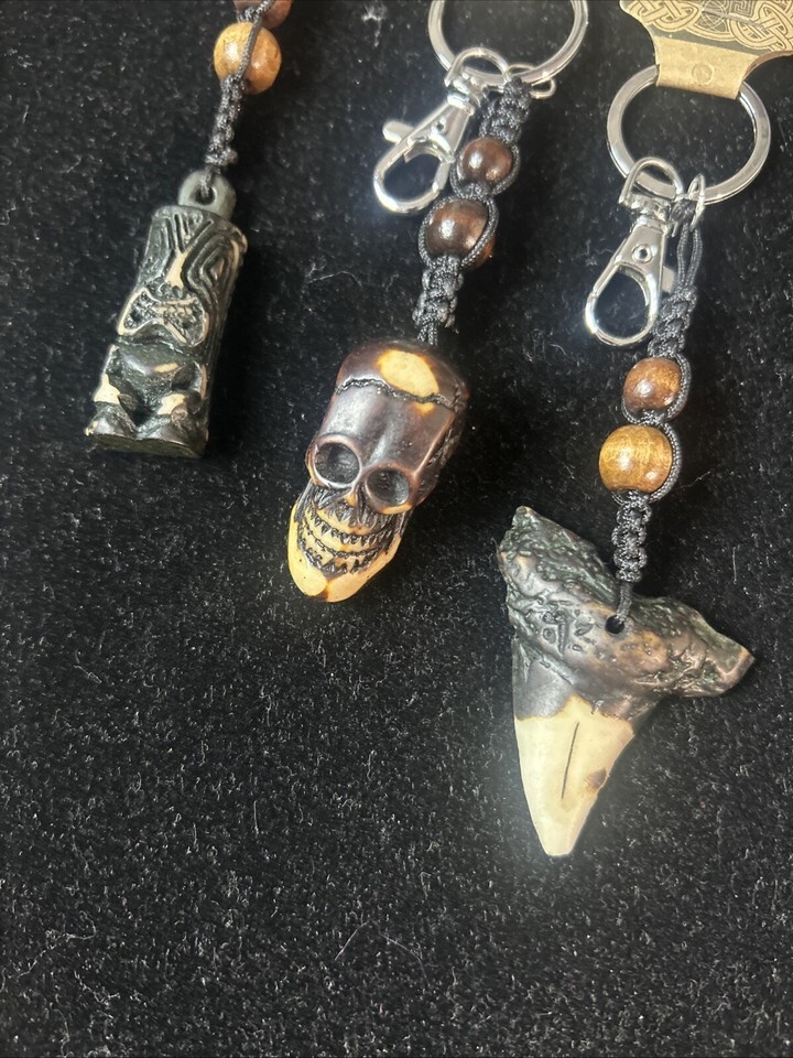 This set of 3 keychains features unique designs, including a skull, tooth, and animal theme. The keychains are adorned with metal, beaded, and wood accents. They are one size fits all and are perfect for both men and women.