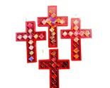 Beautiful set of four red mosaic wall crosses featuring iridescent glass tiles in warm tones of red, pink, orange, and gold. Each cross is crafted with a vibrant red border and shimmering tile inlay that reflects light beautifully. Perfect for adding a touch of faith and color to your home, whether displayed together as a wall grouping or individually.