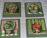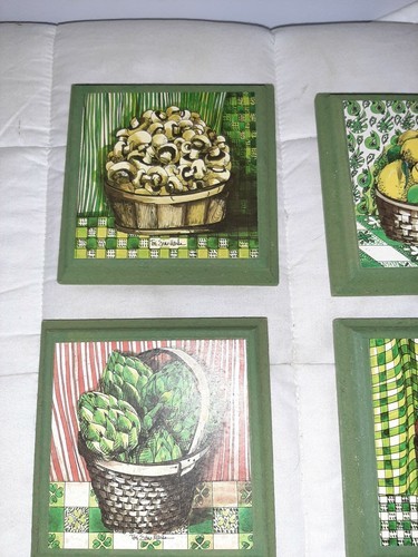 Set of 4 Vintage Toni Evins Marks Plaques Fruit Vegetable Green Kitchen Prints on Wood. These each measure approximately 5 x 5 inches.