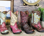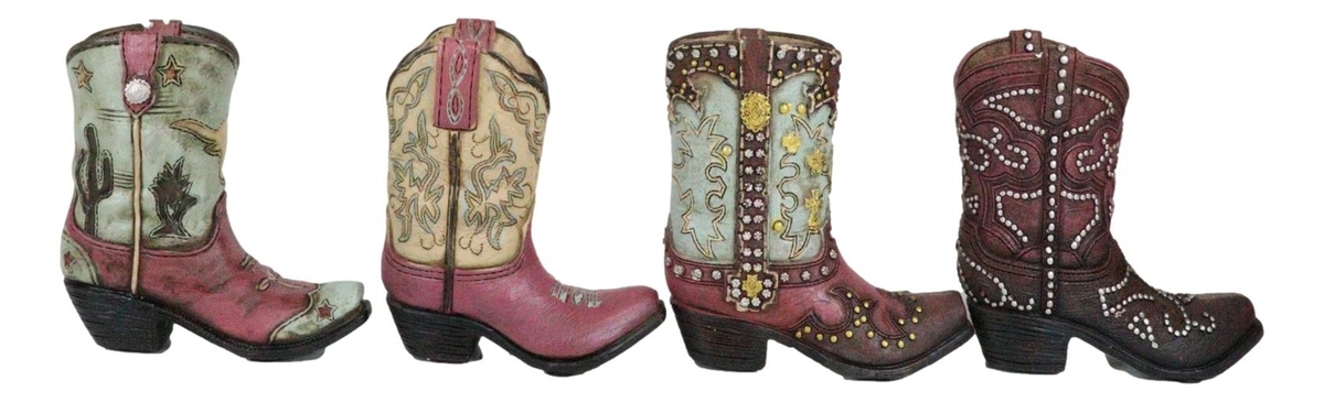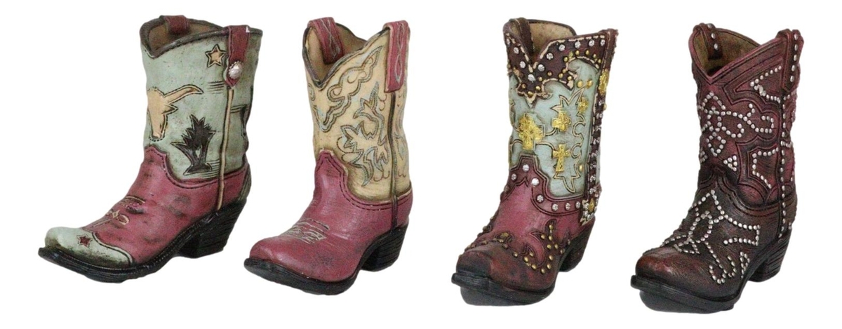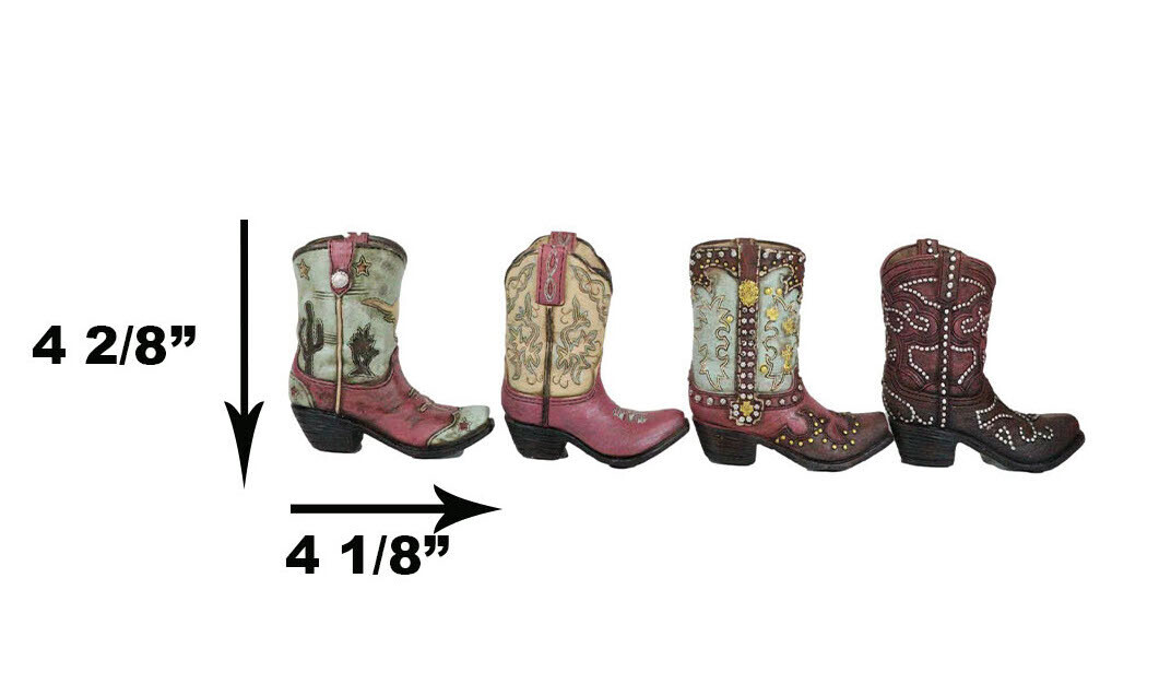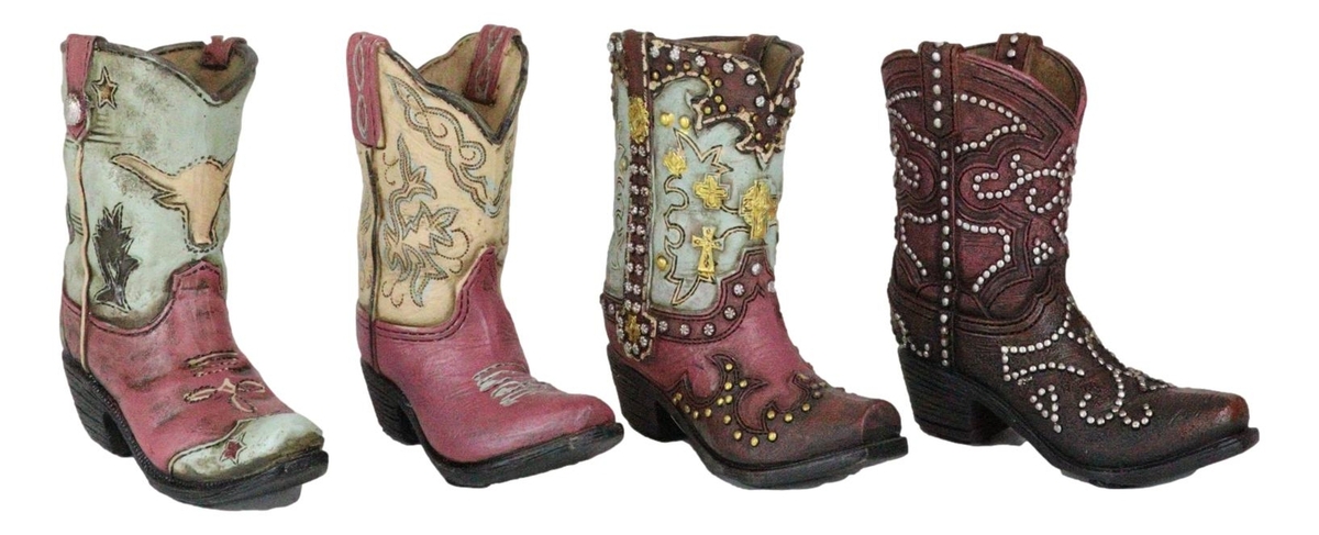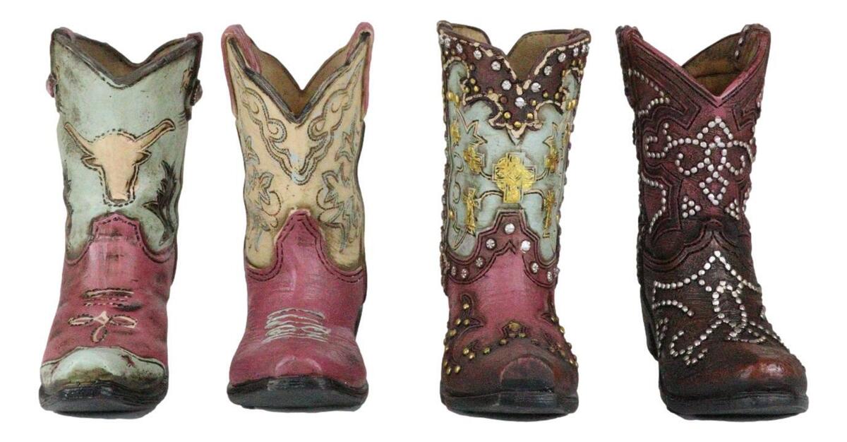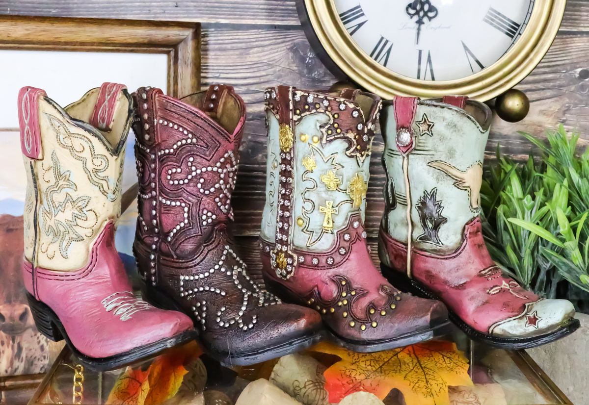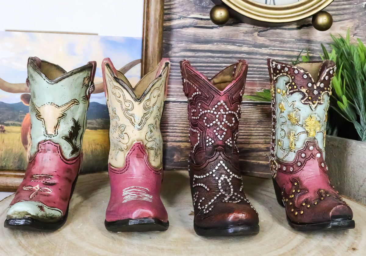 ? Spice up your decor with these cowboy/cowgirl boots accent sculpture. These boots do double duty as pen/stationery or makeup brushes/tools holder as well as an attractive accent piece for your shelves, desks and more. Intricately hand crafted and painted in multi colors, the boots are detailed with western icons like texas longhorn, silver studs and more! The boots are also finished in faux tooled leather look. From a distance, you are gonna think they are real miniature leather boots!