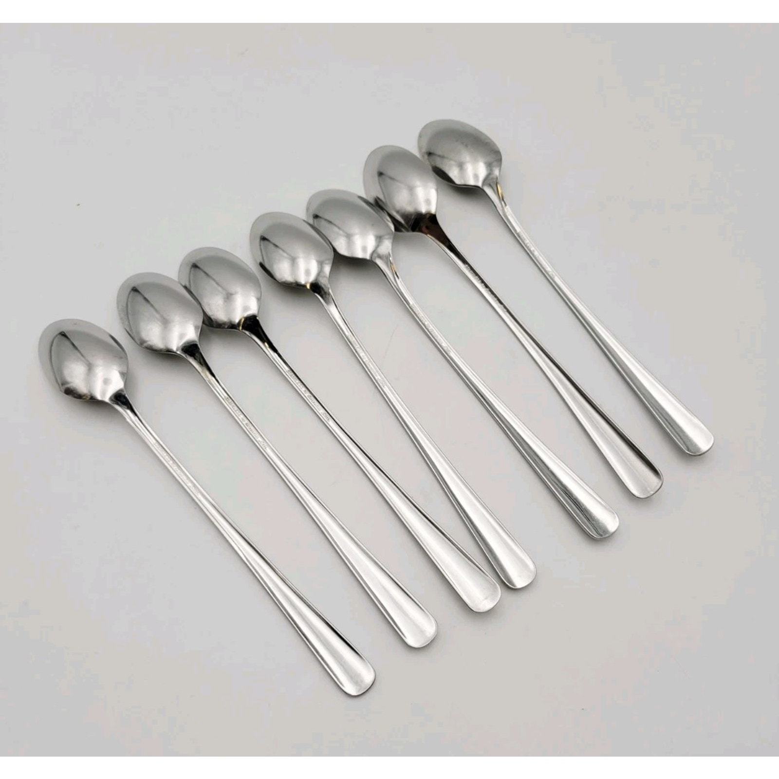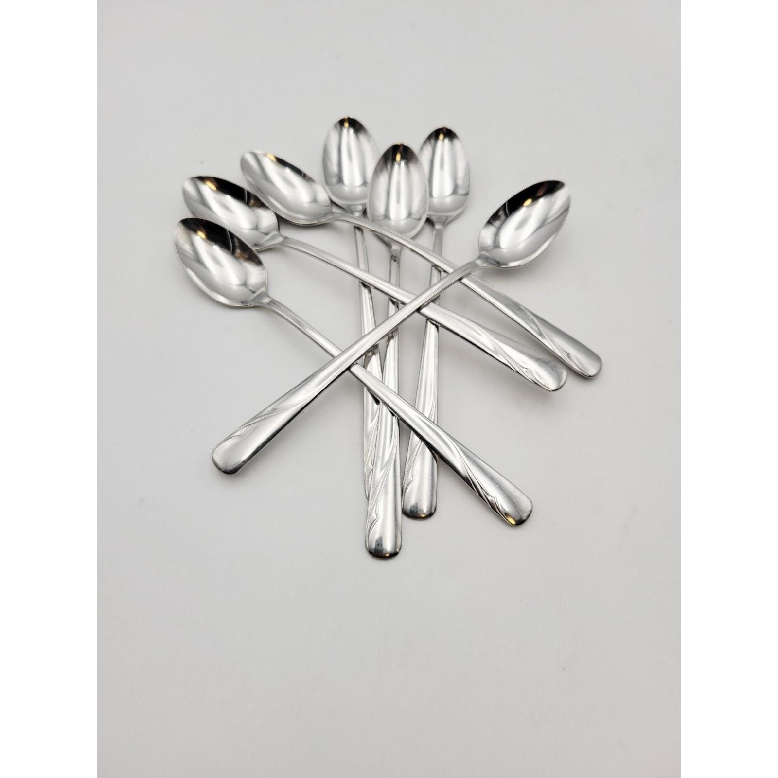 This set includes 7 vintage Oneida Oceanic iced teaspoons, made of stainless steel with a glossy silver finish. The spoons are designed for adult use and have a sleek handle made of stainless steel. Crafted in the United Kingdom, this set is perfect for serving iced tea in style. Each spoon is a classic and durable addition to your flatware collection, adding a touch of elegance to your dining experience.