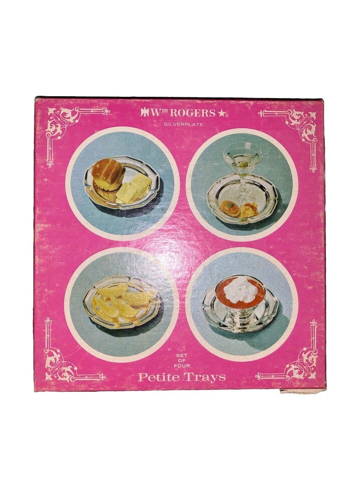 The product is a set of 8 vintage Wm. Rogers 6" Petite trays plates with a silverplated finish and scalloped edges, featuring a mid-century modern style. These antique silver trays are perfect for serving and displaying food or drink in a sophisticated and elegant manner. The unique patina adds a touch of history and character to the design, making them a charming addition to any collection or decor.