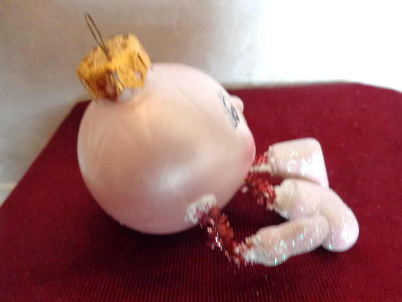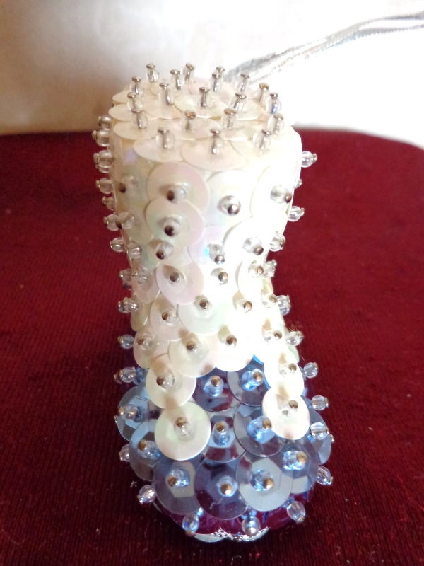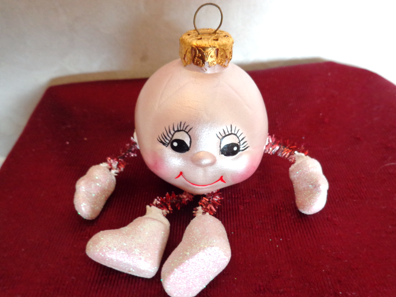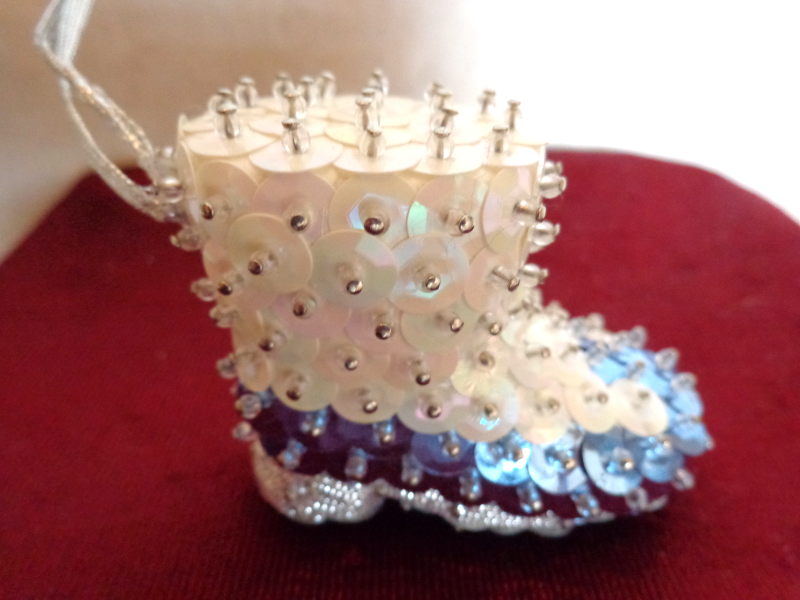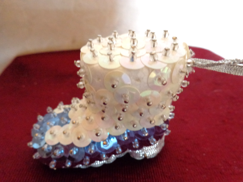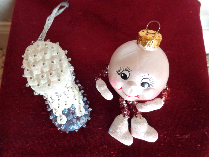 This is a Set of Two Christmas Ornaments (#2817). One is a Boot decorated with White Blue Sequins and the other is a Smiley Face with dangling Hands and Feet. The boot is 2 inches high and 1 inches wide. The smiley face is 1 inches in diameter. They are both in very good condition. Please see pix for a complete description.