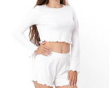 Women?s set made of interlock with raised stitching ? a stylish and comfortable choice for home and sleep. The soft, skin-friendly interlock fabric provides lightness, breathability, and coziness. The top is a cropped long-sleeve (crop top) with sleeves flaring towards the bottom, finished with a wavy edge. The bottom consists of short high-waisted shorts with a soft elastic waistband, also featuring wavy trimming. The decorative raised stitch adds delicacy and originality to the set. Perfect for those who appreciate minimalism with refined details.