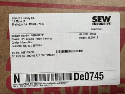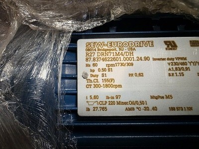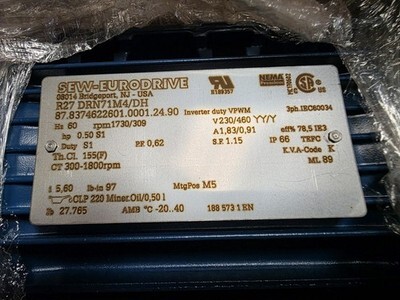 - Sew-Eurodrive Gear Motor R27 DRN71M4/DH 1730/309 RPM 1/2 Hp Inverter Duty