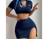 Turn heads and command attention in this sexy navy blue flight attendant costume set. This bold and stylish two-piece outfit includes a fitted short-sleeve crop top with aviation-inspired emblem, a high-waisted mini skirt featuring a daring front slit, and a matching blue satin neck scarf for the perfect finishing touch.