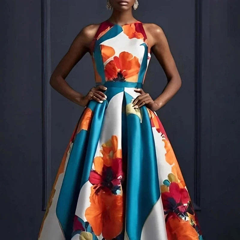 This floor-length, sleeveless dress features a subtle stretch polyester fabric with a floral print, designed for a flattering A-line silhouette. With an O-neck neckline and natural waistline, it offers a comfortable regular fit suitable for any season. The dress exemplifies bohemian style and is crafted from high-quality synthetic fibers, making it an elegant and versatile choice for women seeking sophistication throughout the year.